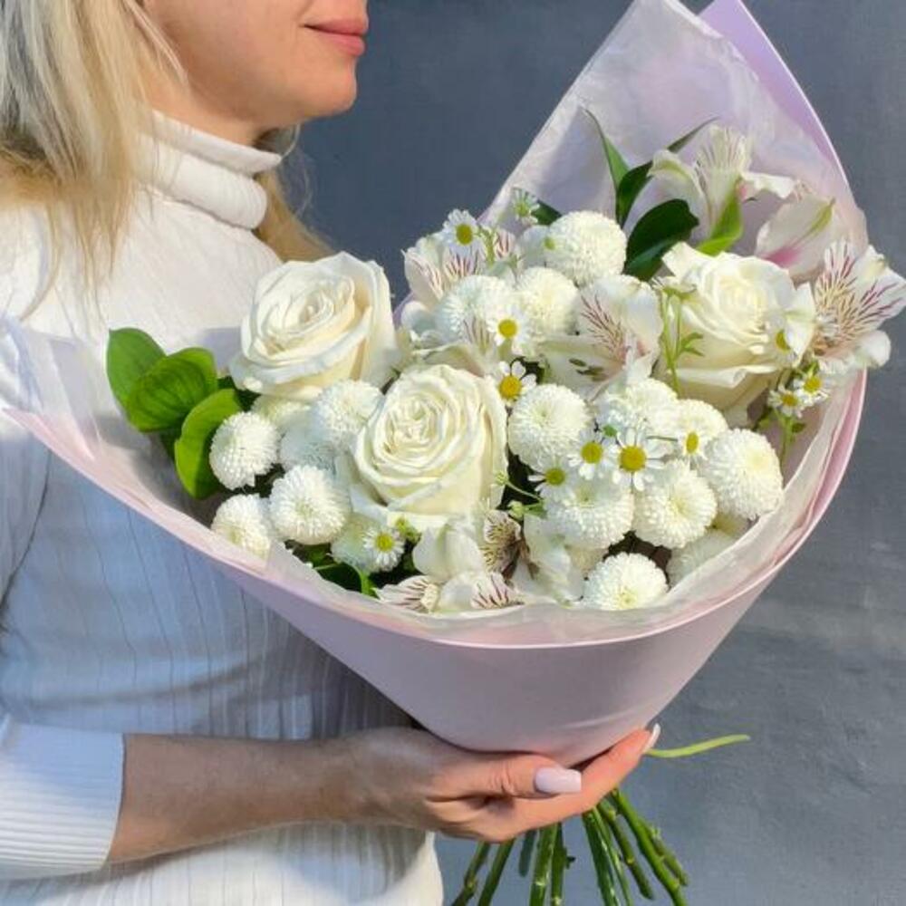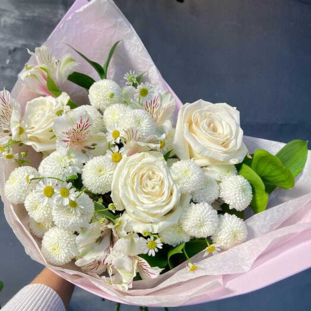 Satin ribbon - 1 pcs Alstroemeria - 3 pcs tanacetum - 2 pcs design packaging - 1 pcs santini white - 3 pcs peony roses ecuador - 3 pcs