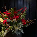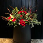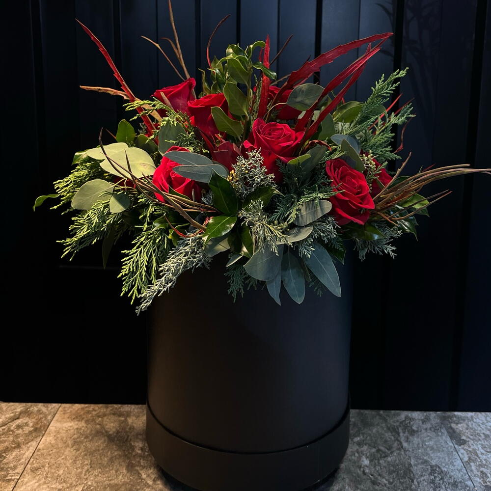 Floral arrangement in a black box with an elegant and sophisticated design. It is made up of short-stemmed red roses combined with varied green foliage, natural branches and touches of winter greenery that add texture and depth. The arrangement has a modern, balanced style, with horizontal volume and a very polished finish, ideal for gifting on special occasions or for elegant, timeless décor.