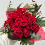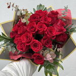 Send a little piece of your heart with our most romantic artisanal arrangement. The Pedacito de Corazón is a dense, high-impact bouquet featuring 21 premium long-stemmed red roses, chosen for their velvety texture and deep, passionate hue. Each rose is nestled in a lush bed of fresh eucalyptus and Mediterranean greenery, providing a fragrant, garden-fresh frame that allows the crimson blooms to take center stage. Hand-tied and presented in a signature multi-layered wrap with a professional artisanal finish, this 40cm-wide bouquet is designed to make a grand, unforgettable statement. • The Blooms: 21 Grade-A premium red roses symbolizing deep love and devotion. • The Greenery: A fresh mix of eucalyptus and seasonal foliage for added volume and a modern aesthetic. • The Presentation: Expertly hand-tied and encased in a premium, high-contrast wrap.