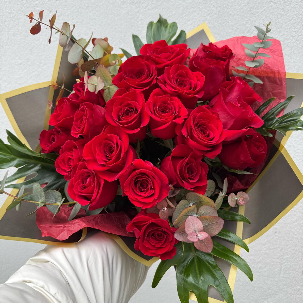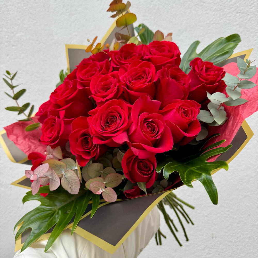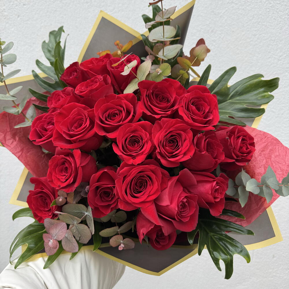 Send a little piece of your heart with our most romantic artisanal arrangement. The Pedacito de Corazón is a dense, high-impact bouquet featuring 21 premium long-stemmed red roses, chosen for their velvety texture and deep, passionate hue. Each rose is nestled in a lush bed of fresh eucalyptus and Mediterranean greenery, providing a fragrant, garden-fresh frame that allows the crimson blooms to take center stage. Hand-tied and presented in a signature multi-layered wrap with a professional artisanal finish, this 40cm-wide bouquet is designed to make a grand, unforgettable statement. • The Blooms: 21 Grade-A premium red roses symbolizing deep love and devotion. • The Greenery: A fresh mix of eucalyptus and seasonal foliage for added volume and a modern aesthetic. • The Presentation: Expertly hand-tied and encased in a premium, high-contrast wrap.