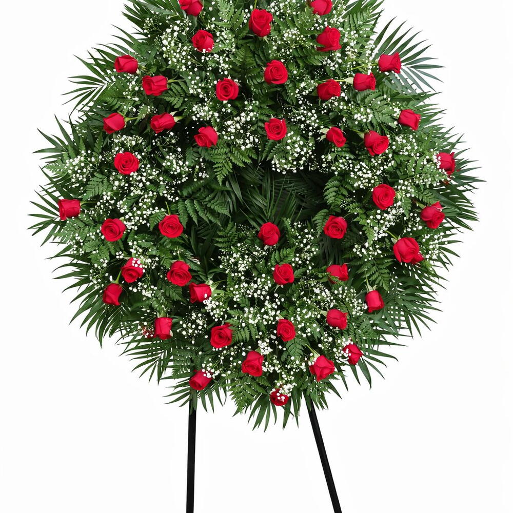 Corona de flores fúnebres para Tanatorio realizada sobre aro de aproximadamente 75 a 80 cm. El color de rosa se atiende de acuerdo a stock y previa coordinación con el cliente. Corona realizada con 50 rosas y verdes.