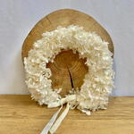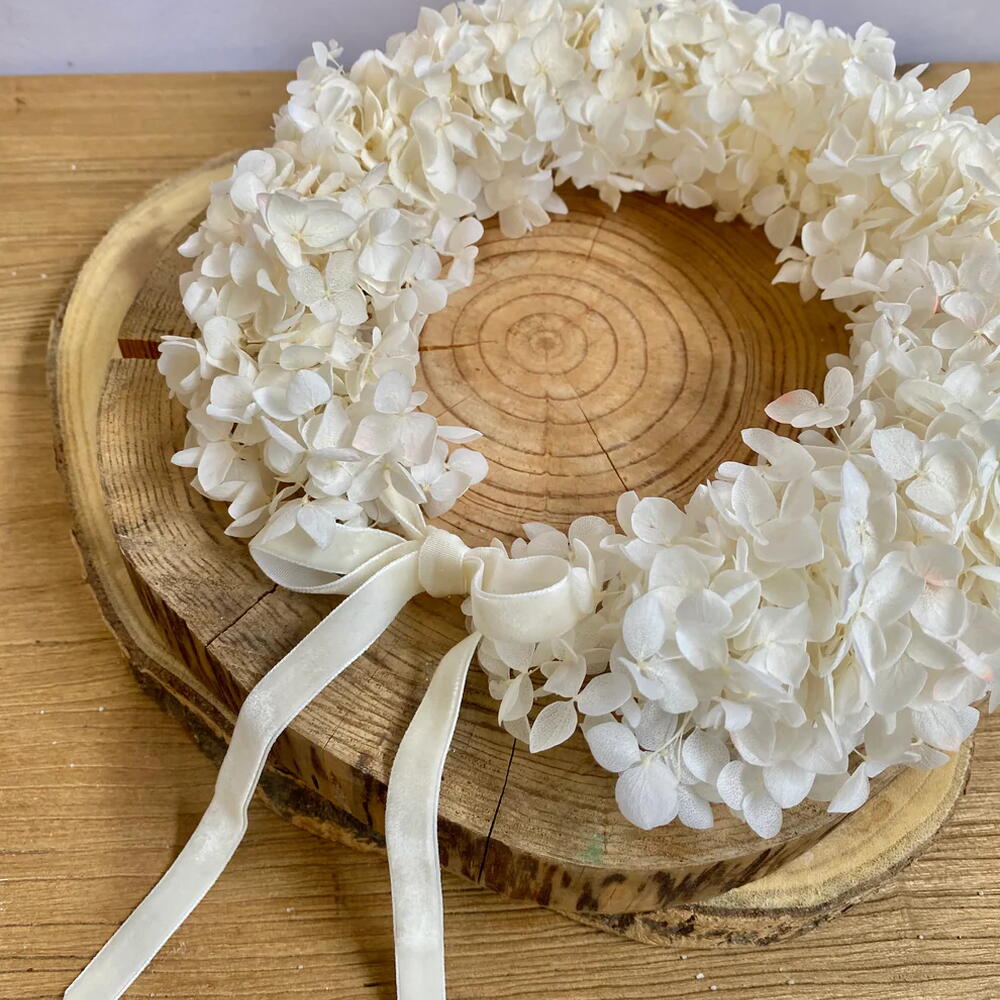 Preserved hydrangea wreath with an adjustable closure via a velvet ribbon. Available in different colors: white, cream, light pink, sky blue and sea green.