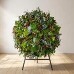This original funeral wreath stands out for its natural style and deep symbolism of eternal life. Composed mainly of assorted greens, it conveys serenity, balance and a connection to nature. The shades of leaves and textures create a rich and elegant composition, ideal for a sober and respectful farewell. The small reddish accents add warmth, representing the love and memory that remain. Its harmonious design wraps with calm and dignity, offering comfort in difficult moments. It is a perfect choice for those seeking a different tribute, full of meaning and naturalness. A floral tribute that expresses respect with simplicity and organic beauty.