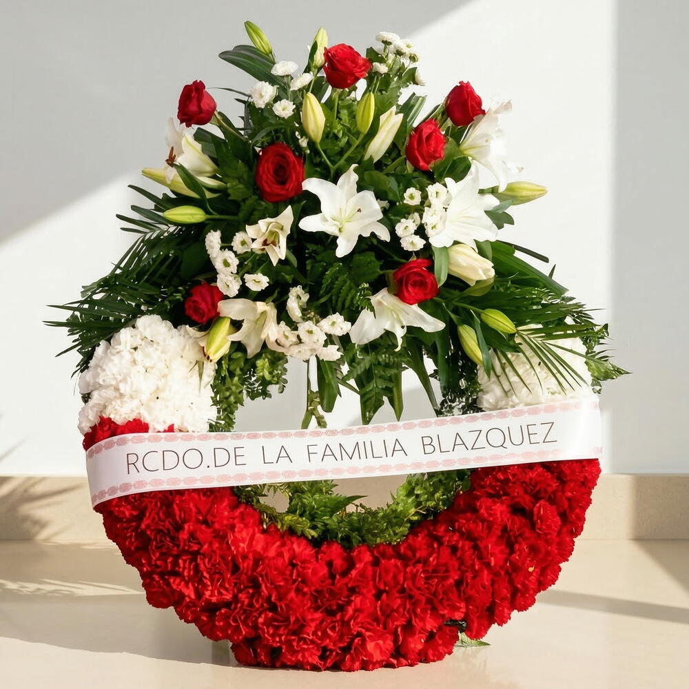 This elegant funeral wreath is made of high-quality natural flowers carefully selected to express respect and condolences. It consists of a harmonious blend of white lilies, red roses, red carnations, white chrysanthemums and daisies, complemented by fresh foliage that highlights its beauty and solemnity. This wreath with a 70 cm diameter ring is perfect for honoring at ceremonies and funerals. It includes a special ribbon to convey a farewell message, ensuring that your feelings are expressed in a meaningful and respectful way.