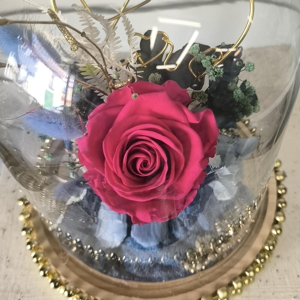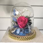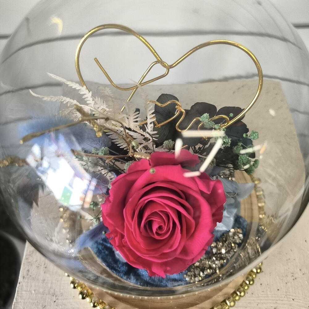 dome - 1 pcs eternal fuchsia rose - 1 pcs various preserved fillings - 3 pcs gold love pin - 1 pcs