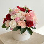 A romantic and sophisticated hatbox, designed with a delicate combination of roses, carnations and lisianthus in shades of pink, white and red. Its harmony of colors and textures symbolizes sincere love and the tenderness of promises that endure. Presented in an elegant white box with a red ribbon, Dolce Promessa is the perfect gift to celebrate anniversaries, to express love or to surprise with a gesture full of sweetness and elegance.