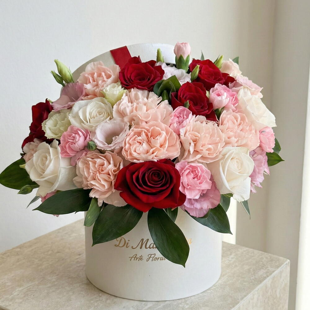 A romantic and sophisticated hatbox, designed with a delicate combination of roses, carnations and lisianthus in shades of pink, white and red. Its harmony of colors and textures symbolizes sincere love and the tenderness of promises that endure. Presented in an elegant white box with a red ribbon, Dolce Promessa is the perfect gift to celebrate anniversaries, to express love or to surprise with a gesture full of sweetness and elegance.