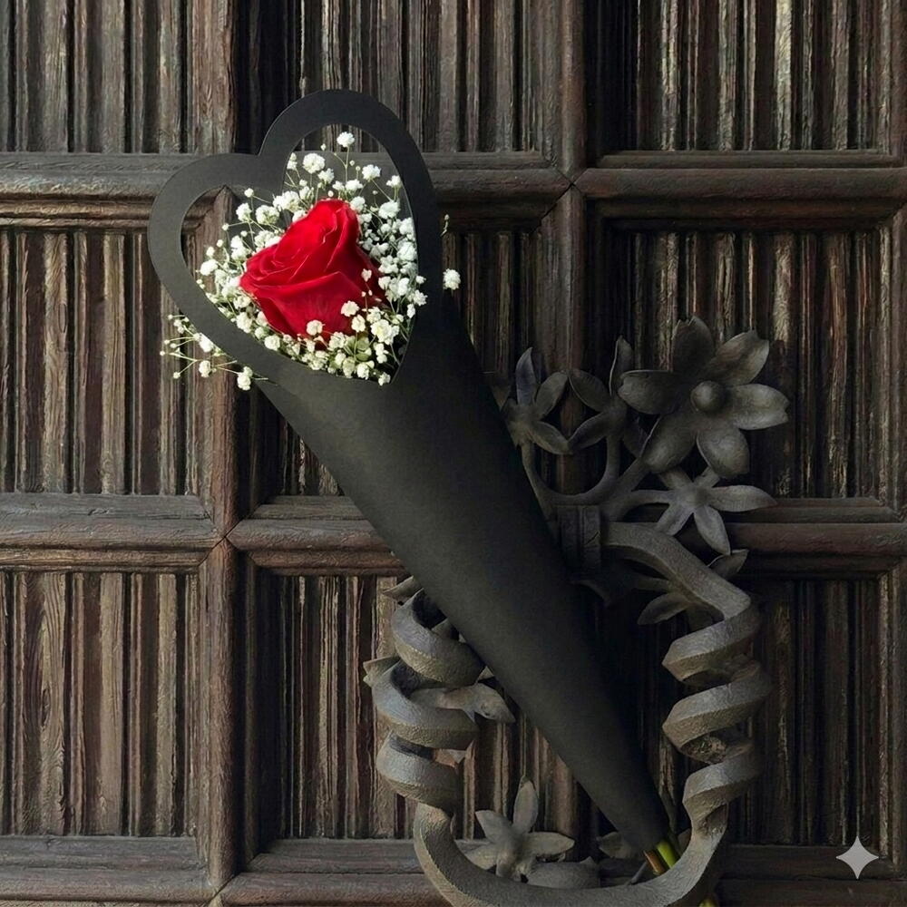 A natural red rose, the purest symbol of Sant Jordi. Accompanied by a delicate touch of baby's breath and presented in an elegant neutral-toned wrapping. Simple, pretty and straightforward: the perfect detail to celebrate Sant Jordi with authenticity. - Delivery available in Barcelona - The classic that never fails