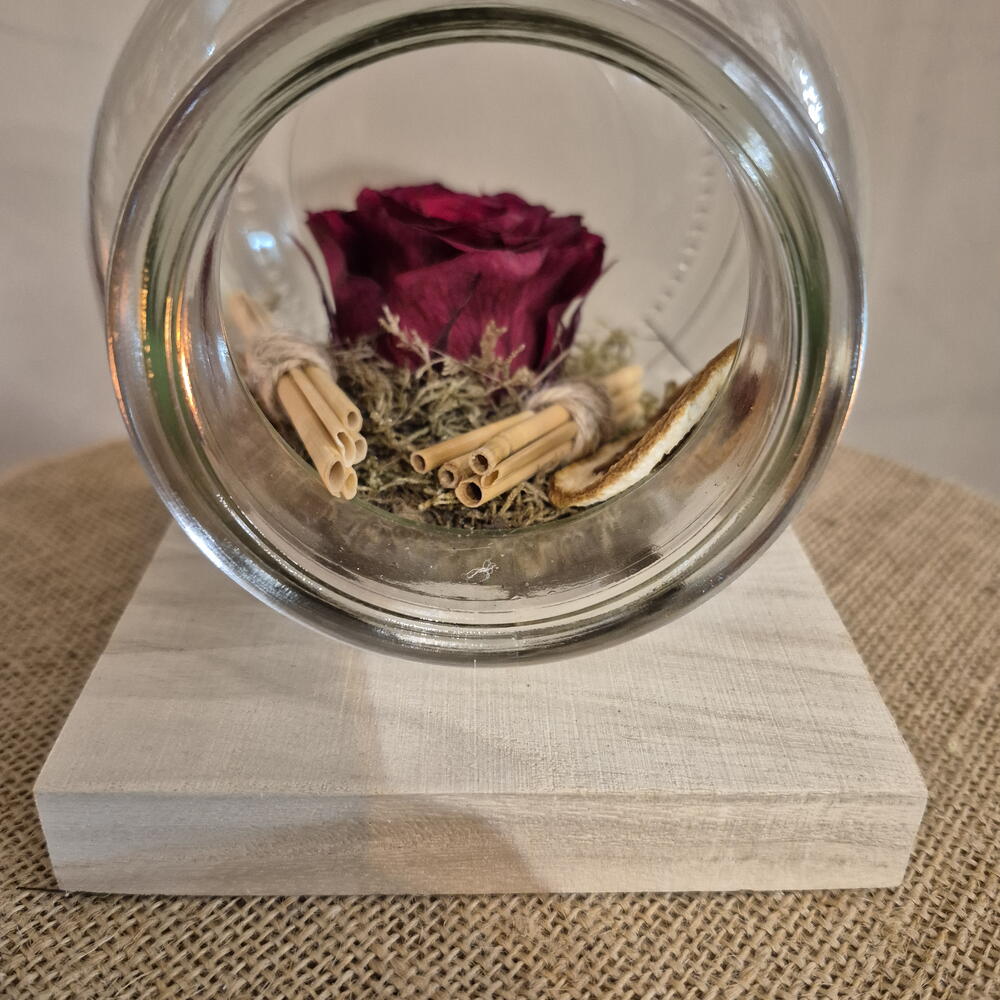 preserved moss - 1 pcs freeze-dried orange - 2 pcs dedication card - 1 pcs freeze-dried red rose - 1 pcs overturned glass jar - 1 pcs