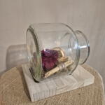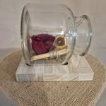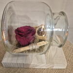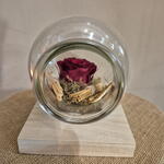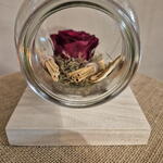 An overturned glass jar that holds a freeze-dried red and orange rose, like an eternal message that has escaped time. A delicate gesture that symbolizes love, remembrance and enduring emotion. The rose, suspended in its fall, seems to speak in silence: what you feel today can last forever.