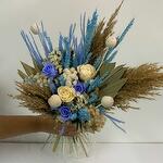 A preserved bouquet that stands out for its elegant, streamlined composition, where the color blue takes center stage through roses and wheat spikes. This unique creation blends cool and warm tones, achieving a perfect balance between modernity and nature. Ideal for those seeking a harmonious, long-lasting combination that fills any space with life and style.