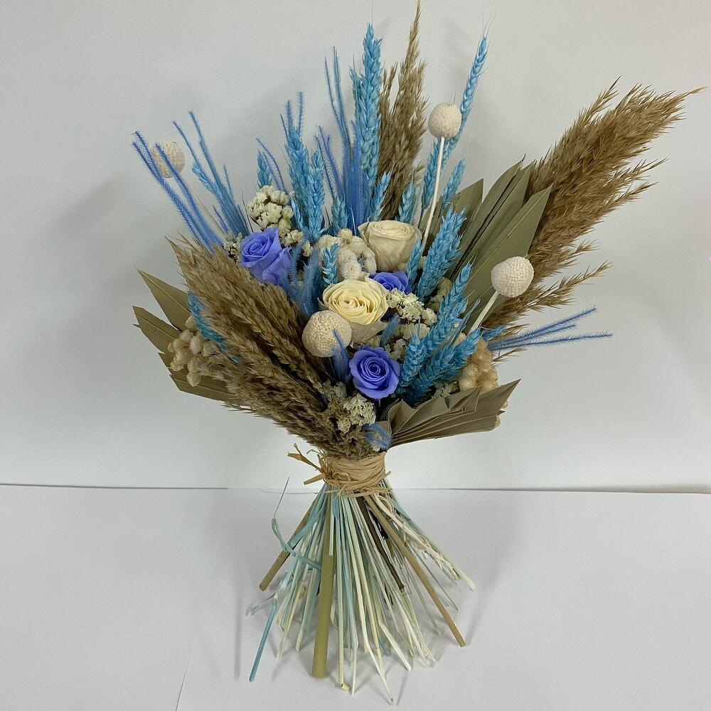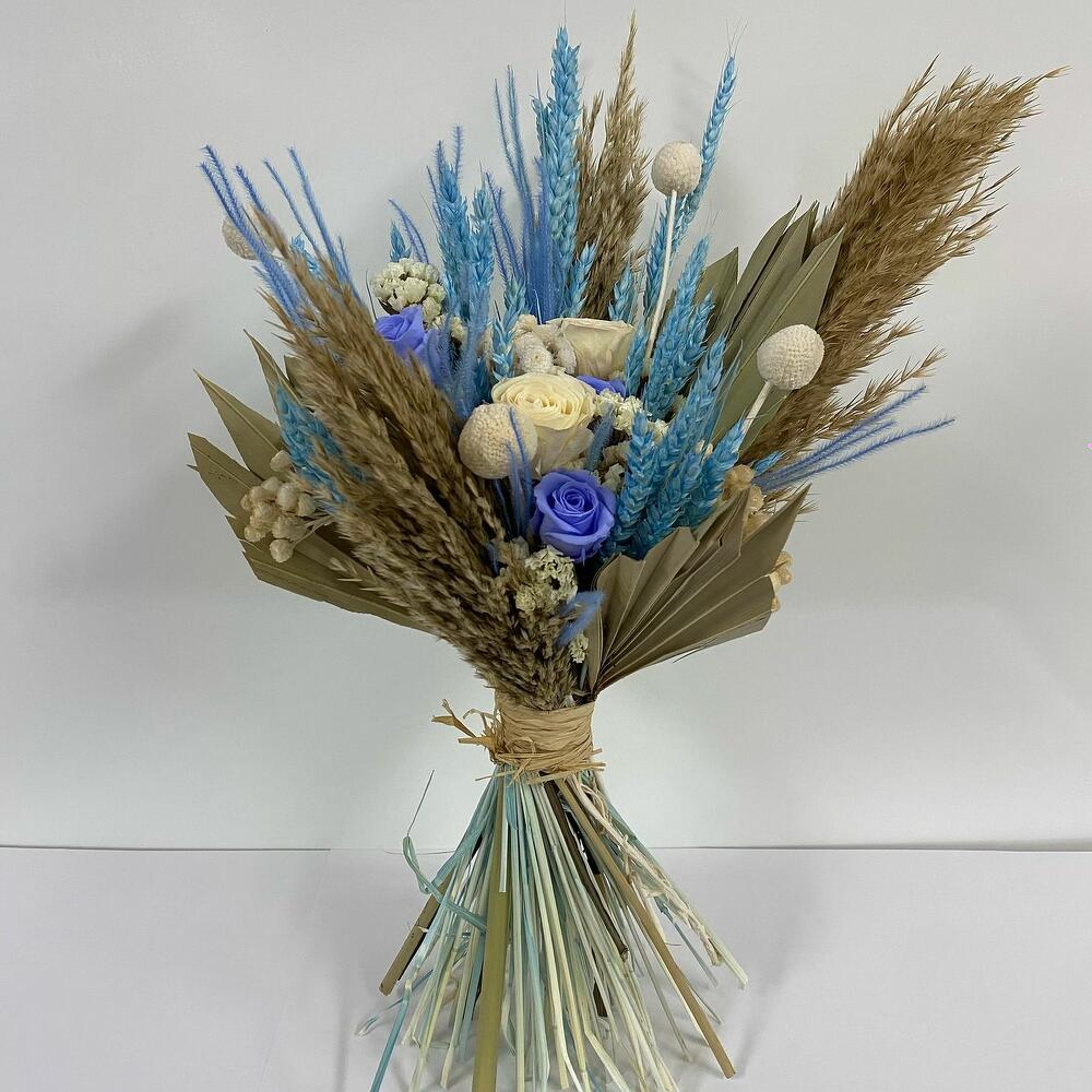 A preserved bouquet that stands out for its elegant, streamlined composition, where the color blue takes center stage through roses and wheat spikes. This unique creation blends cool and warm tones, achieving a perfect balance between modernity and nature. Ideal for those seeking a harmonious, long-lasting combination that fills any space with life and style.
