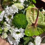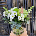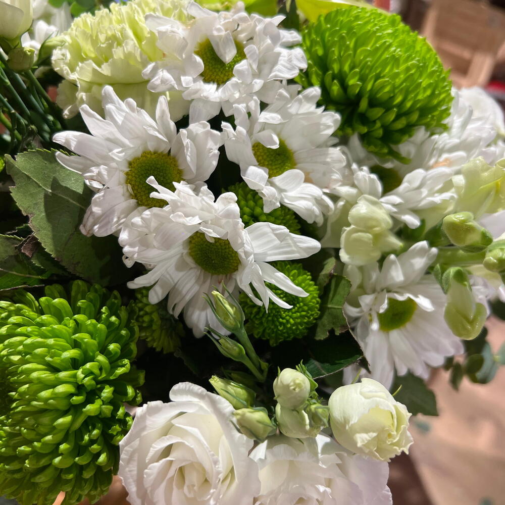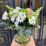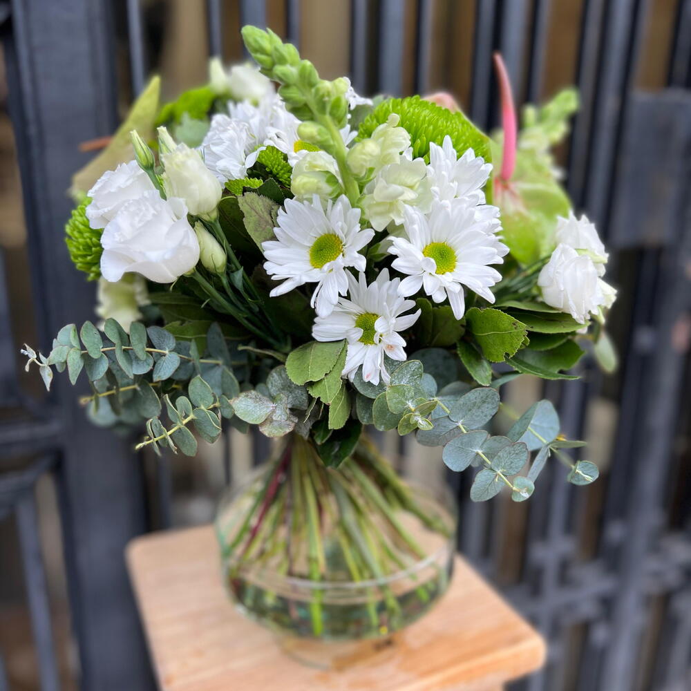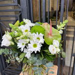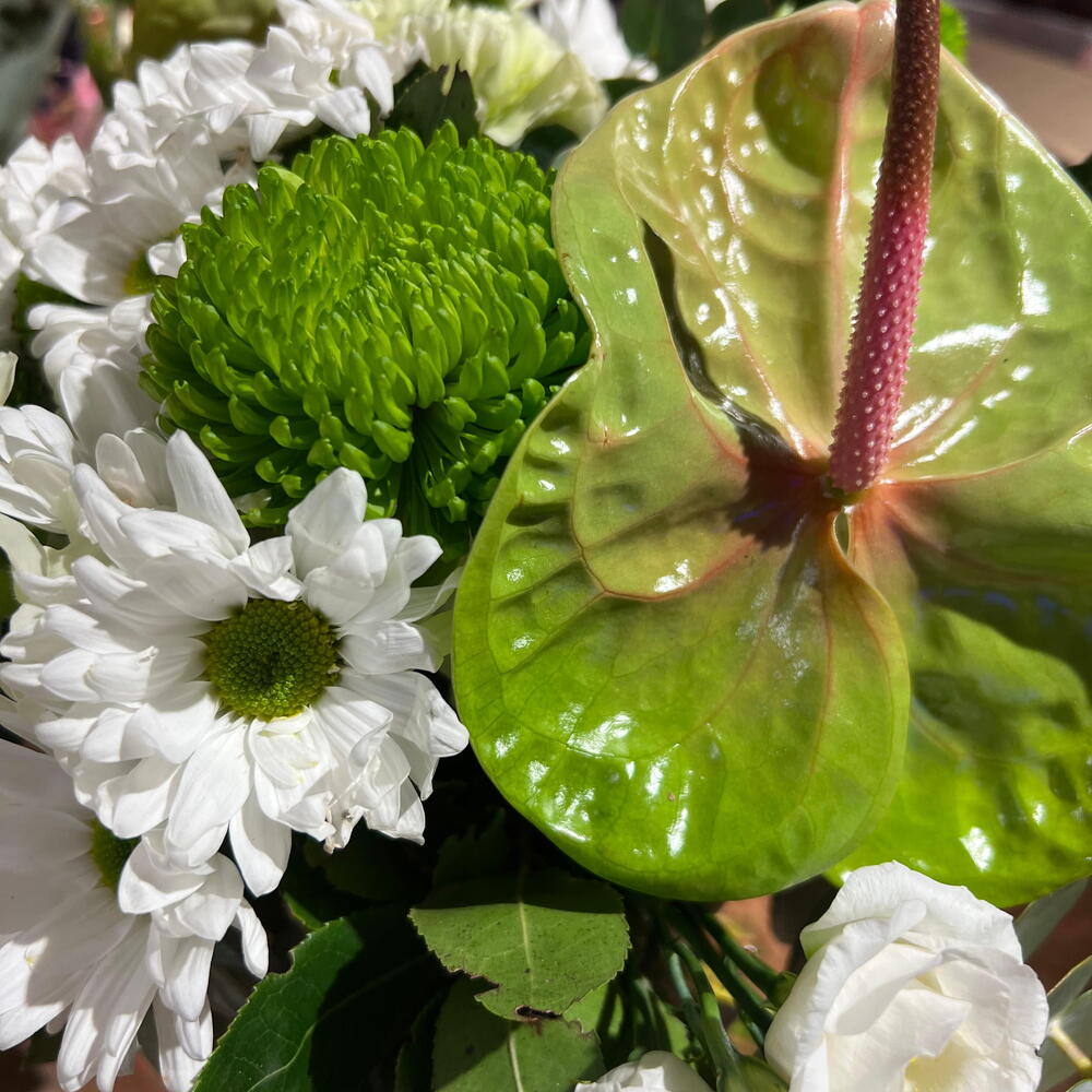 anthurium - 2 pcs eucalipto cinerea - 5 pcs anastasia green - 2 pcs lisiantus blanco - 3 pcs green anthurium - 2 pcs green santini - 2 pcs white daisy - 3 pcs green dianthus - 2 pcs