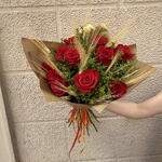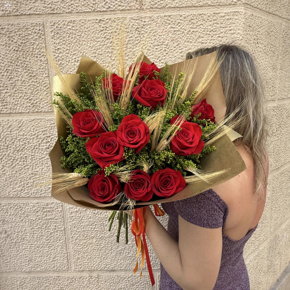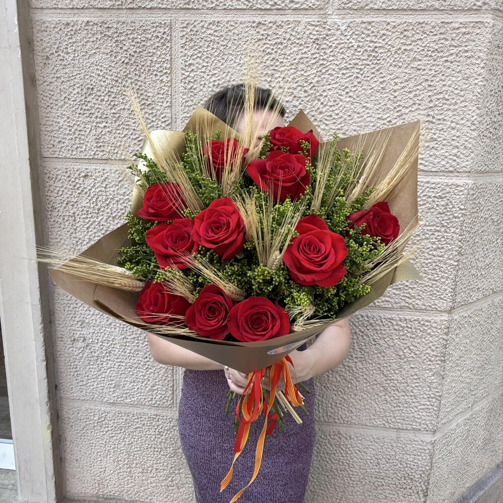 Elegante, intenso y lleno de pasión — este impresionante ramo de rosas rojas es la elección perfecta para expresar sentimientos profundos. Cada rosa destaca por su color vibrante y su forma impecable, creando una композиция llena de fuerza y sofisticación. Los detalles naturales como espigas doradas y verdes frescos aportan textura y un toque distintivo, mientras que el envoltorio en tonos kraft resalta la belleza clásica del arreglo con un aire moderno y refinado. Ideal para ocasiones especiales, declaraciones de amor o momentos inolvidables, este ramo no solo sorprende — emociona. Un regalo que habla por sí solo y deja una huella imborrable.