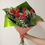 This beautiful designer bouquet offers a unique harmony of flowers, composed of 6 red roses and assorted greenery, adding freshness and sophistication to the composition. Each flower in the arrangement has been carefully selected and placed to create a floral arrangement with exceptional design and charisma. Ideal for any memorable occasion, this bouquet represents elegance and affection in its fullest expression.