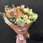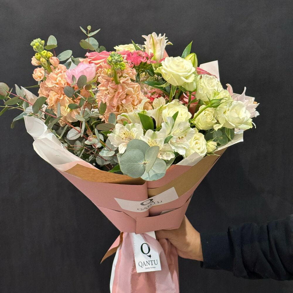 The romantic and elegant Pastel Charm bouquet combines soft pastel tones that lend delicacy and refinement to the composition. Lush cream and peach roses, together with ethereal alstroemerias and lisianthus, harmonize perfectly with pink carnations and airy eucalyptus. This bouquet is an ideal gift for those who appreciate beauty in the details and love to surround themselves with elegance.