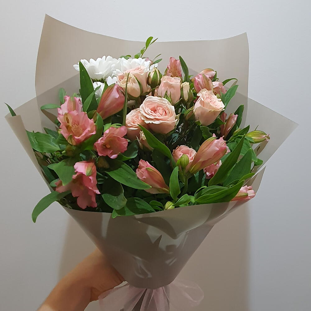 Alstroemeria - 5 pcs crisantemo - 1 pcs verde decorativo - 2 pcs envoltorio decorativo - 1 pcs petiminí rose - 1 pcs