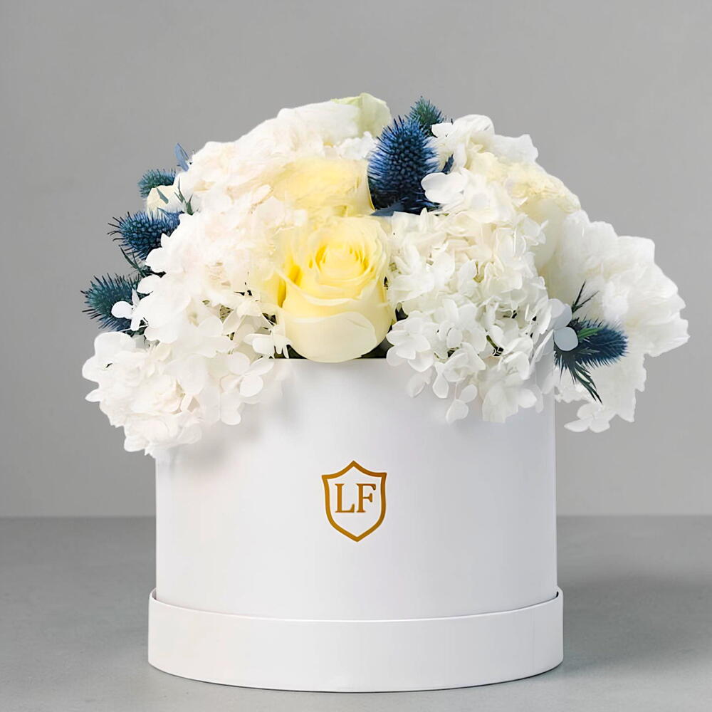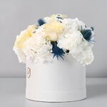 PREMIUM Box of Preserved White Roses and Hydrangeas A luxurious floral creation that combines the elegance of 6 preserved white roses with the delicacy of carefully selected hydrangeas. Designed to last for more than 5 years, this floral masterpiece is presented in an exclusive white round box with the Les Fleurs logo, perfect for gifting or decorating any space with sophistication and style.