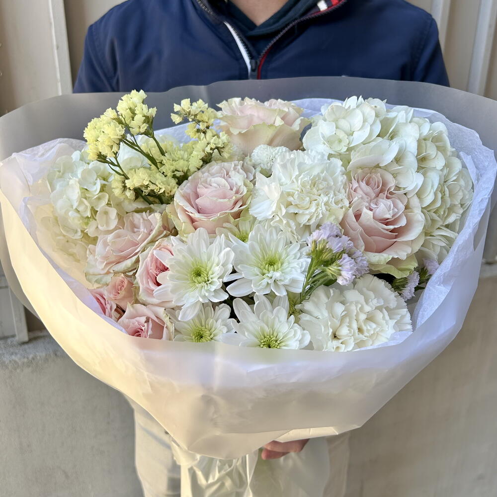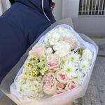 Statice - 3 pcs hydrangea - 2 pcs clavel - 2 pcs rose spray - 1 pcs pink mondial rose - 5 pcs chrisantema white - 2 pcs