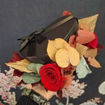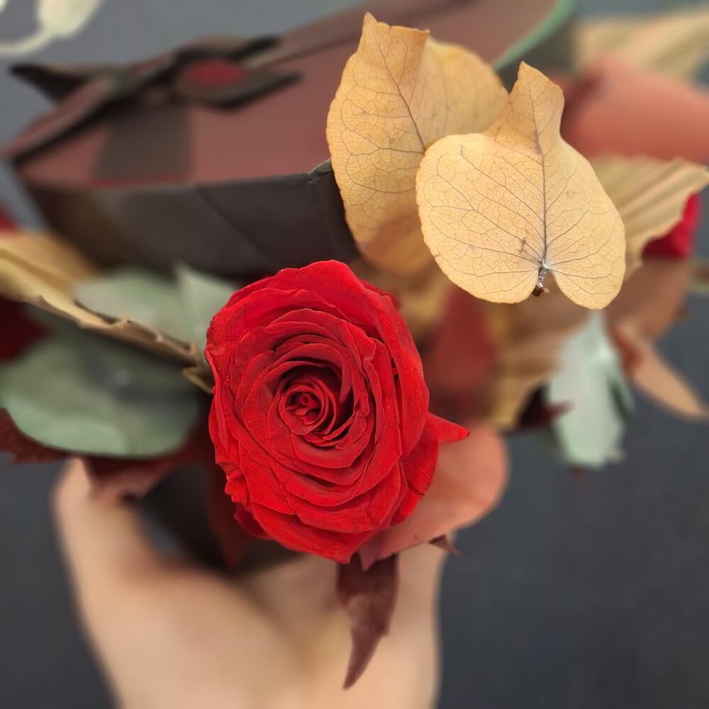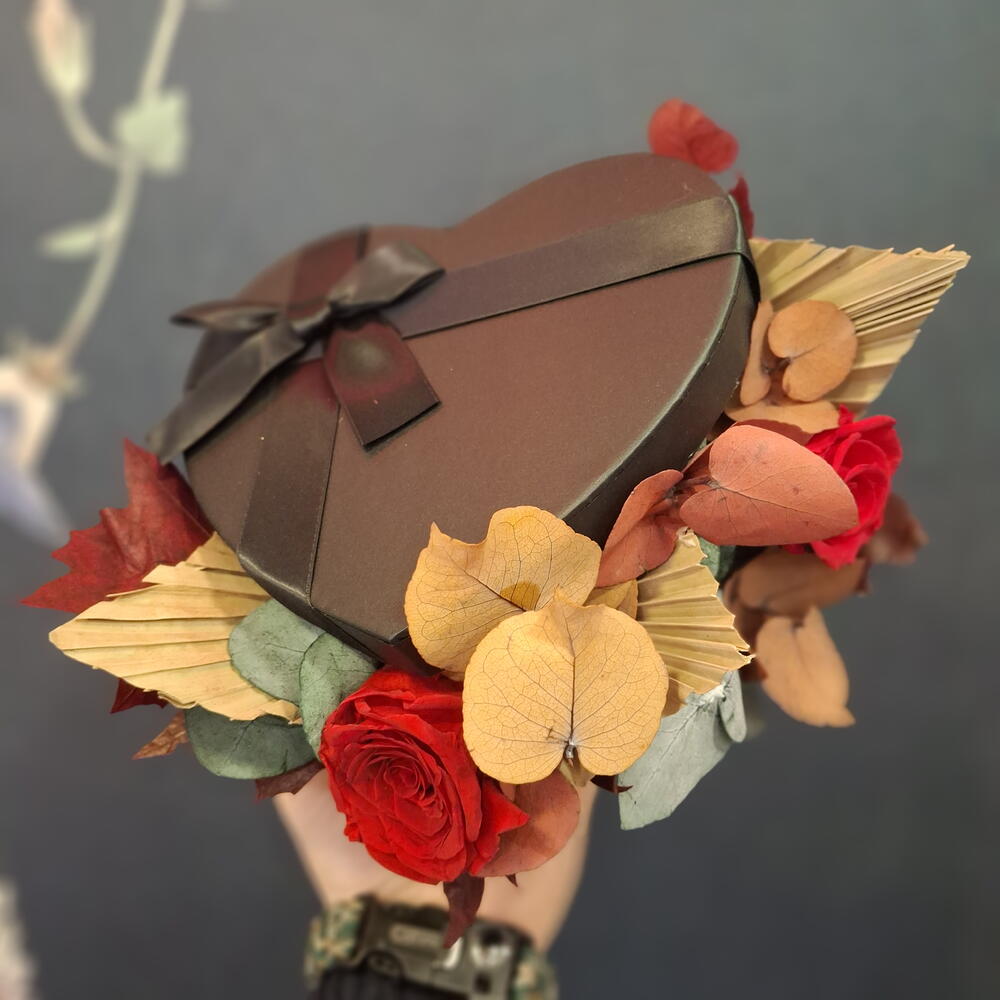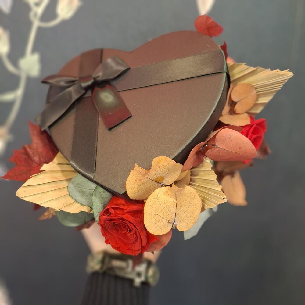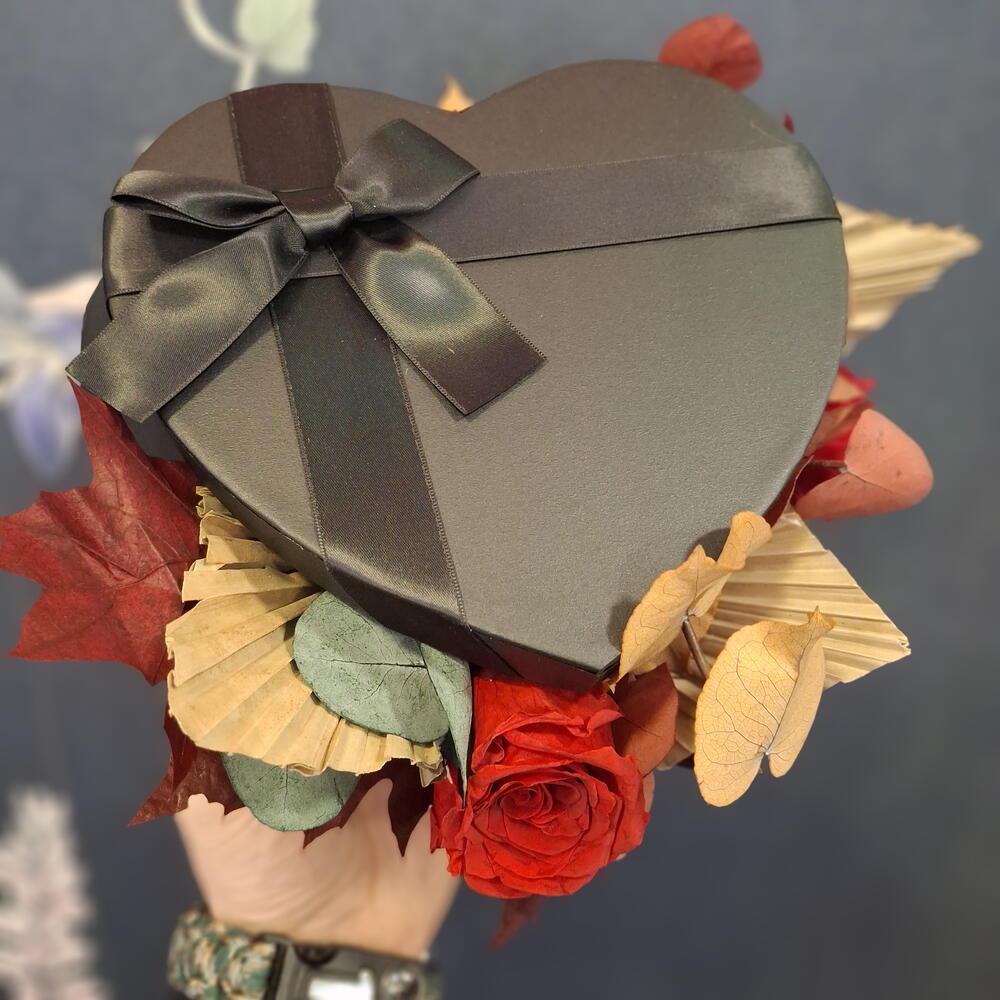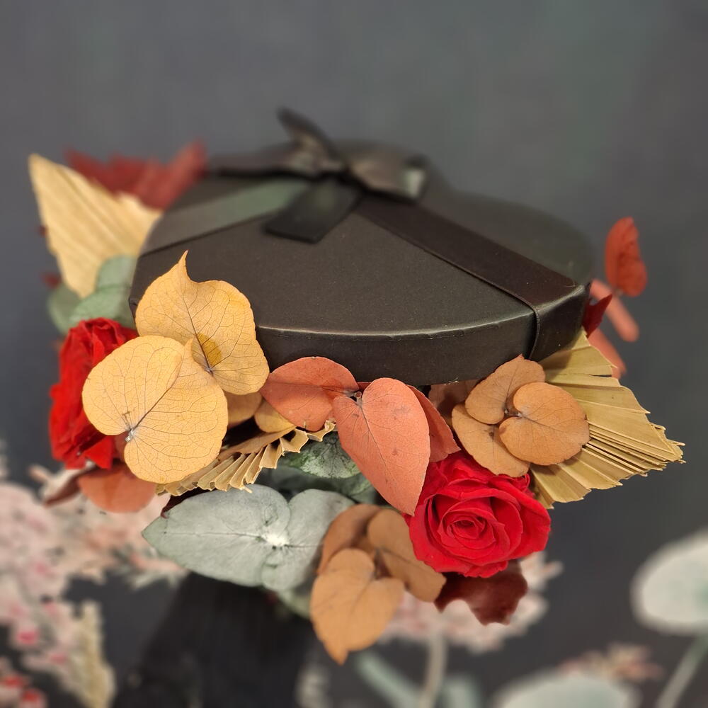 palm leaves - 3 pcs eucalipto preservado - 6 pcs lazo de cinta - 1 pcs large eternal rose - 1 pcs black chocolate box - 1 pcs small eternal rose - 1 pcs preserved autumnal eucalyptus - 6 pcs