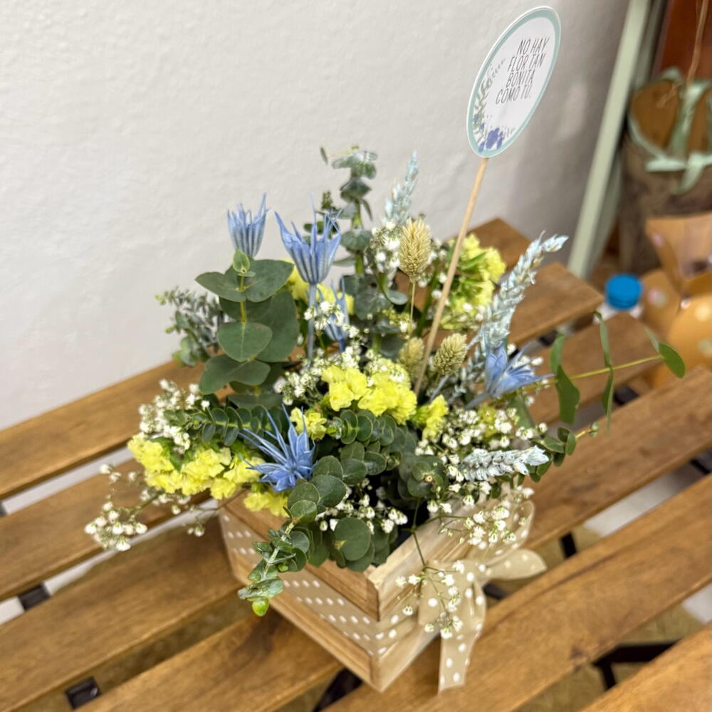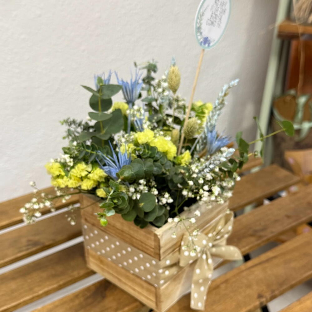 Eucalyptus - 6 pcs paniculata - 2 pcs estatice - 2 pcs card - 1 pcs espigas preservadas - 7 pcs wooden box - 1 pcs fabric ribbon - 1 pcs nigeria - 5 pcs