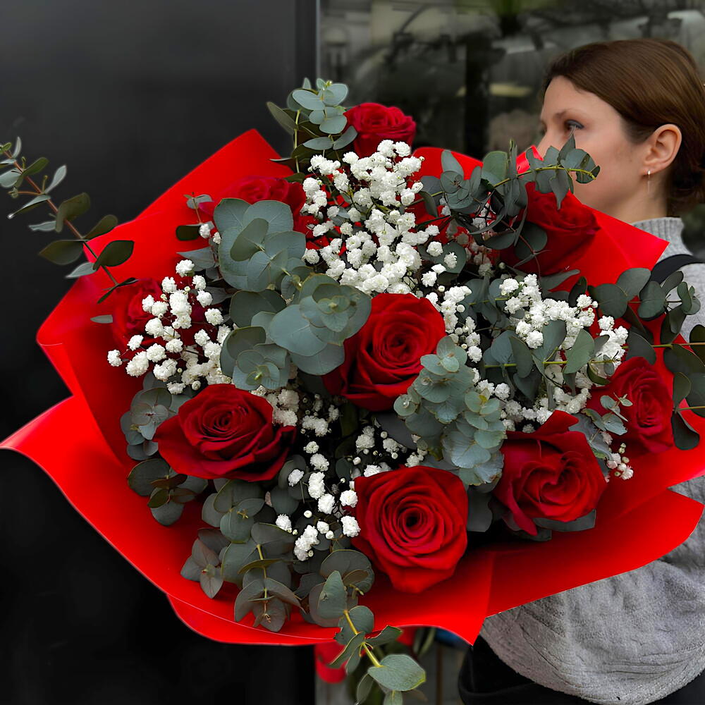 eucalyptus - 5 pcs paniculata - 5 pcs rosas rojas - 9 pcs