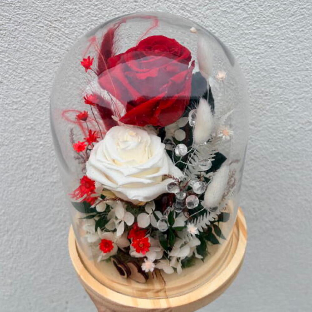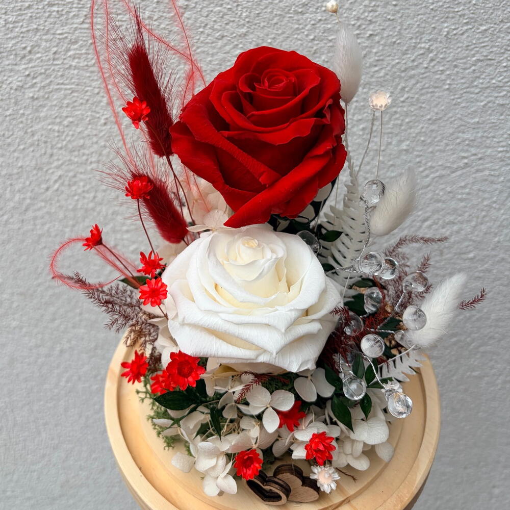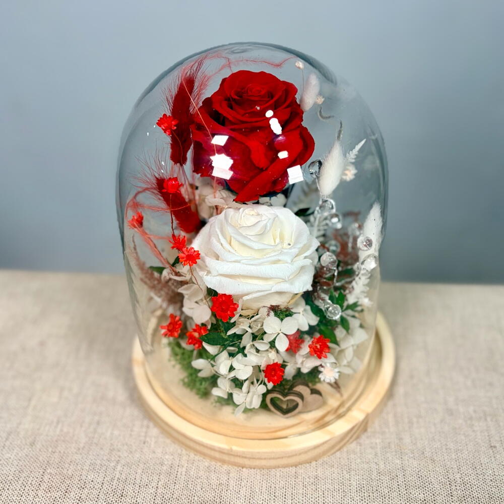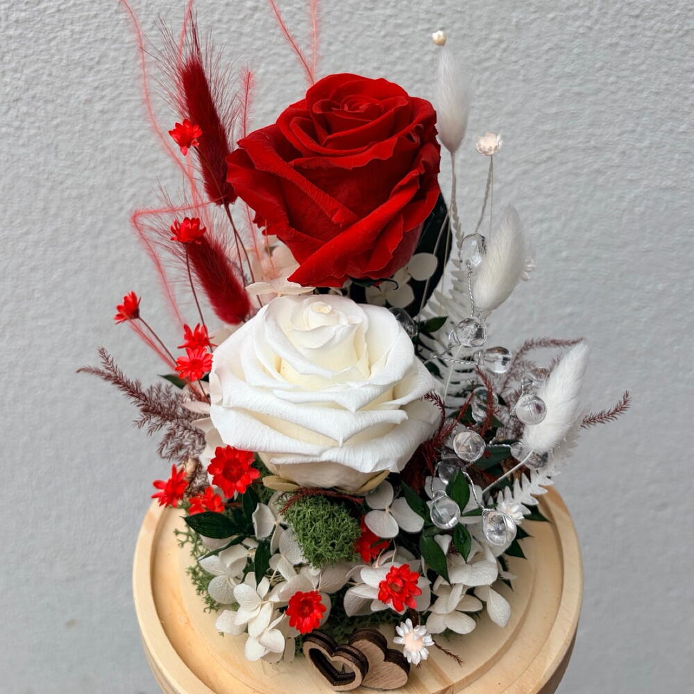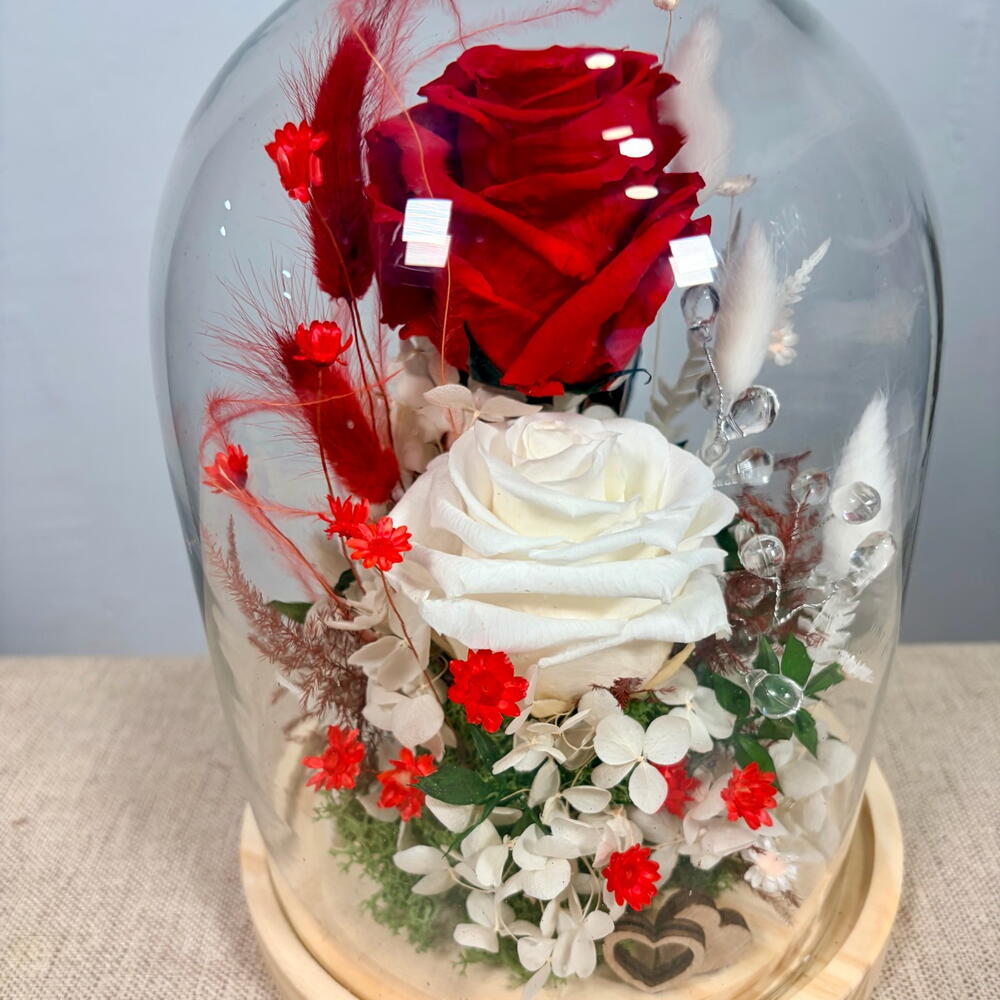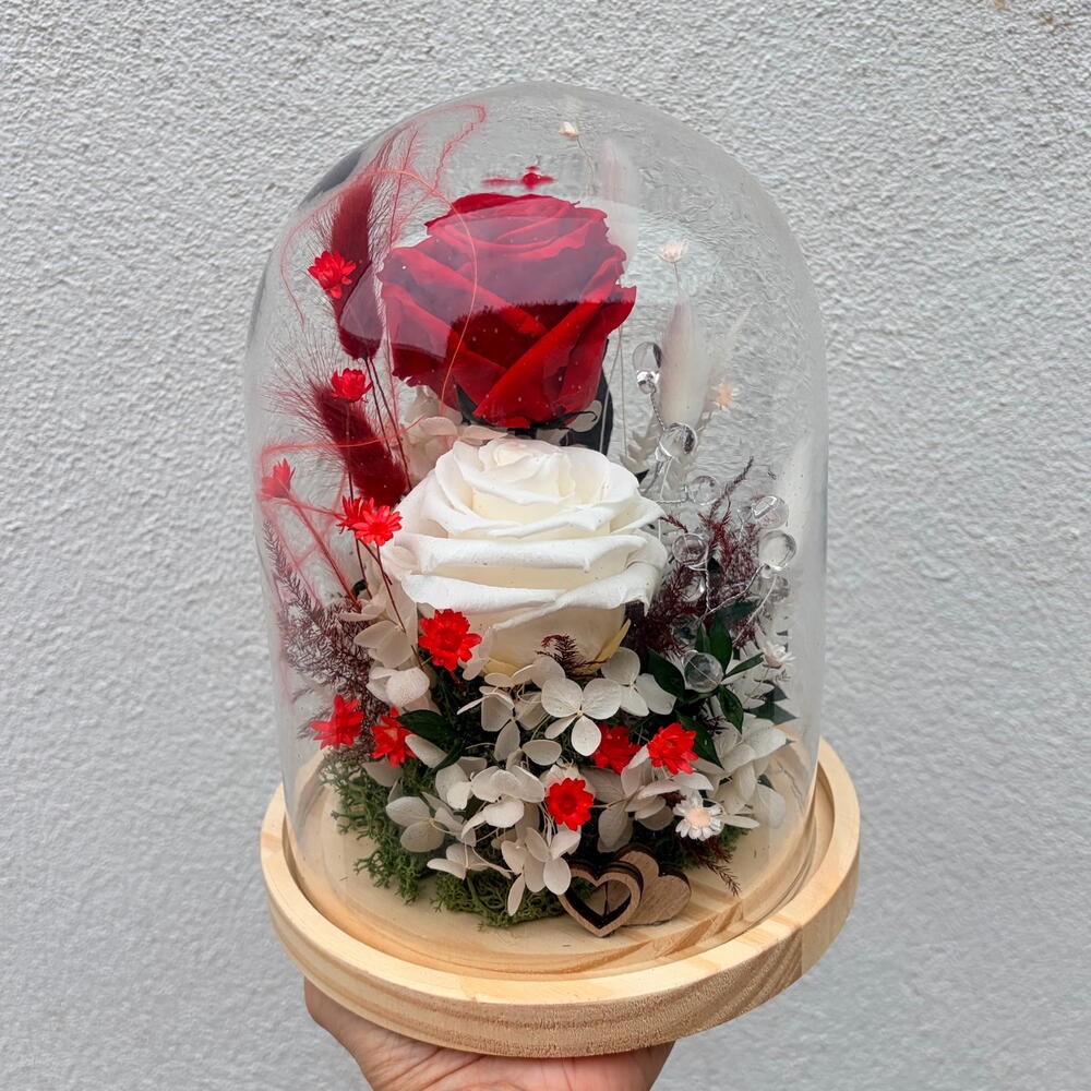 Capture the essence of eternal love with our Fire Ice preserved arrangement. This handcrafted glass dome features two premium, long-lasting roses- a fiery crimson and a pure snow white-nestled among delicate dried botanicals and ethereal accents. Designed to last for years without water or sunlight, this 20cm tall arrangement serves as a permanent symbol of a bond that never fades. Whether it’s an anniversary, a just because gift, or a statement piece for your home, this dome brings a touch of enchanted luxury to any space. • Longevity: Lasts 1–3 years with proper care. • Care Tip: Keep out of direct sunlight and high humidity. No watering required.