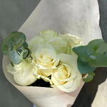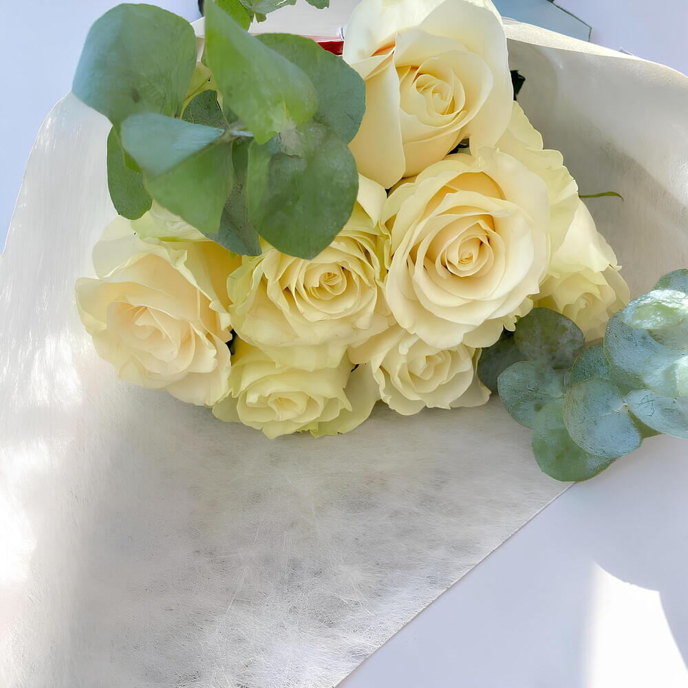 A delicate bouquet of white roses that symbolizes purity and elegance. Decorated with eucalyptus leaves and wrapped in a sophisticated transparent paper, this bouquet is ideal for weddings, anniversaries or any special occasion that deserves a touch of distinction.