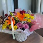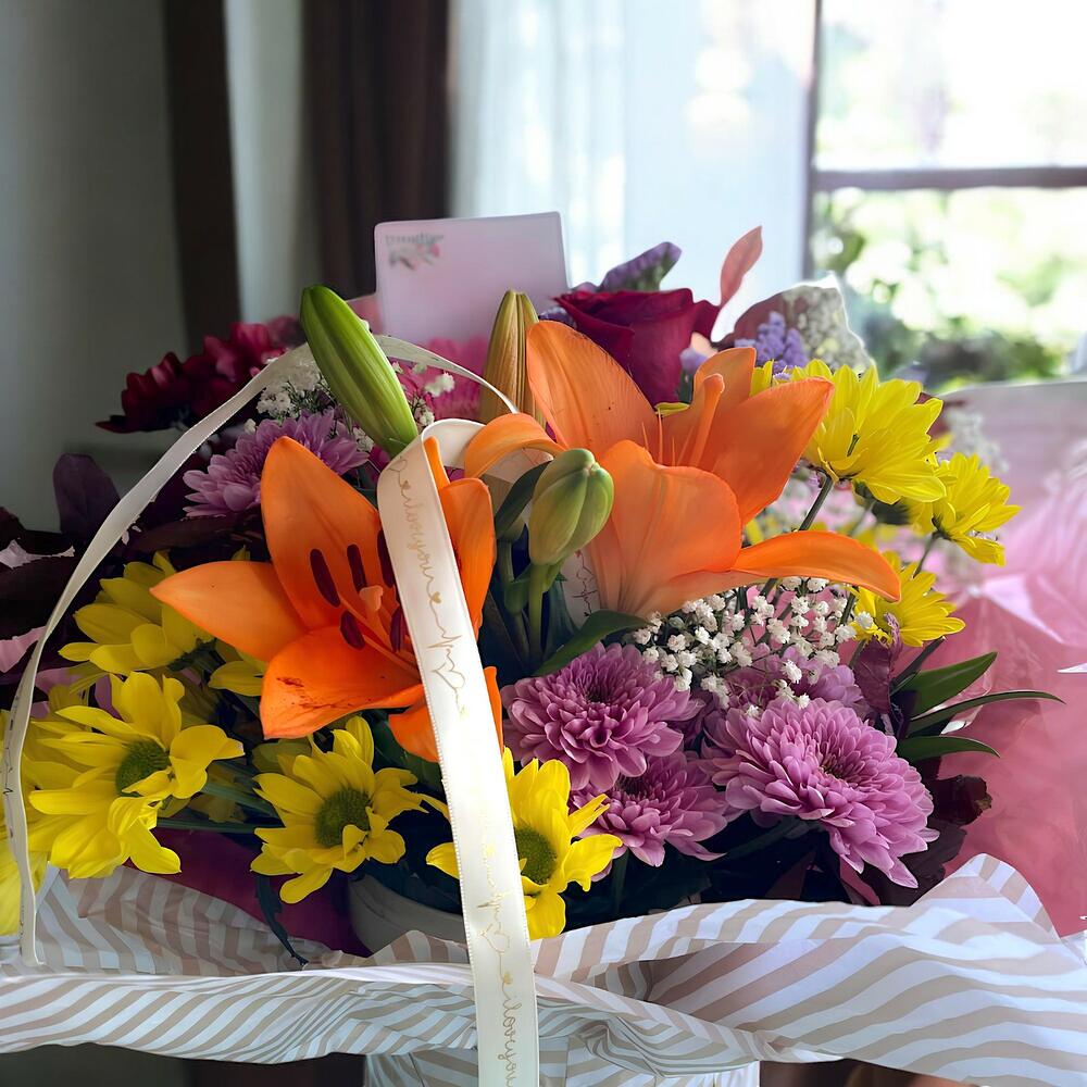 This cheerful floral arrangement includes a vibrant selection of mixed flowers in shades of orange, yellow, purple, and red, complemented with fresh greenery. Ideal for conveying joy and positive energy on any occasion.