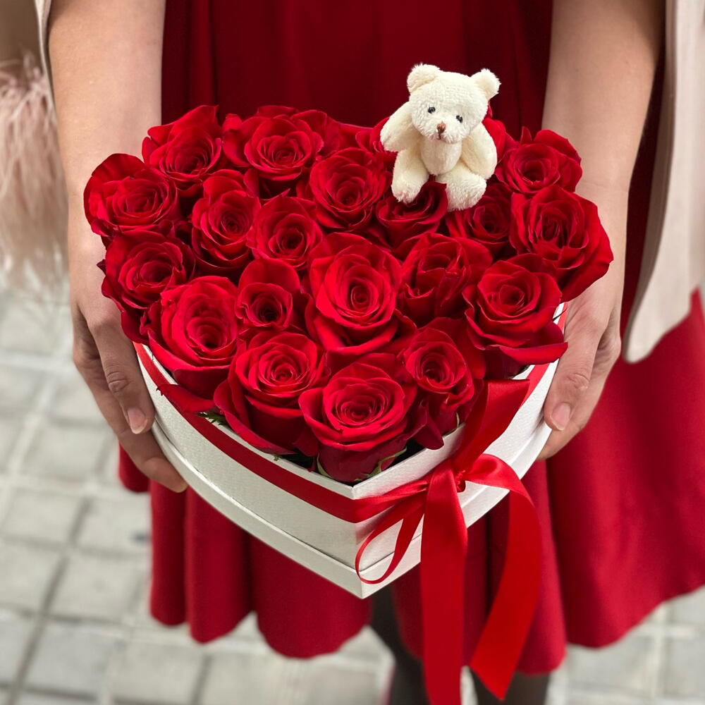 This charming heart-shaped gift box will surprise and delight. It contains a cuddly teddy bear and twenty beautiful roses to show your love and affection. This extraordinary piece is the perfect gift for a loved one, making any occasion an unforgettable moment.