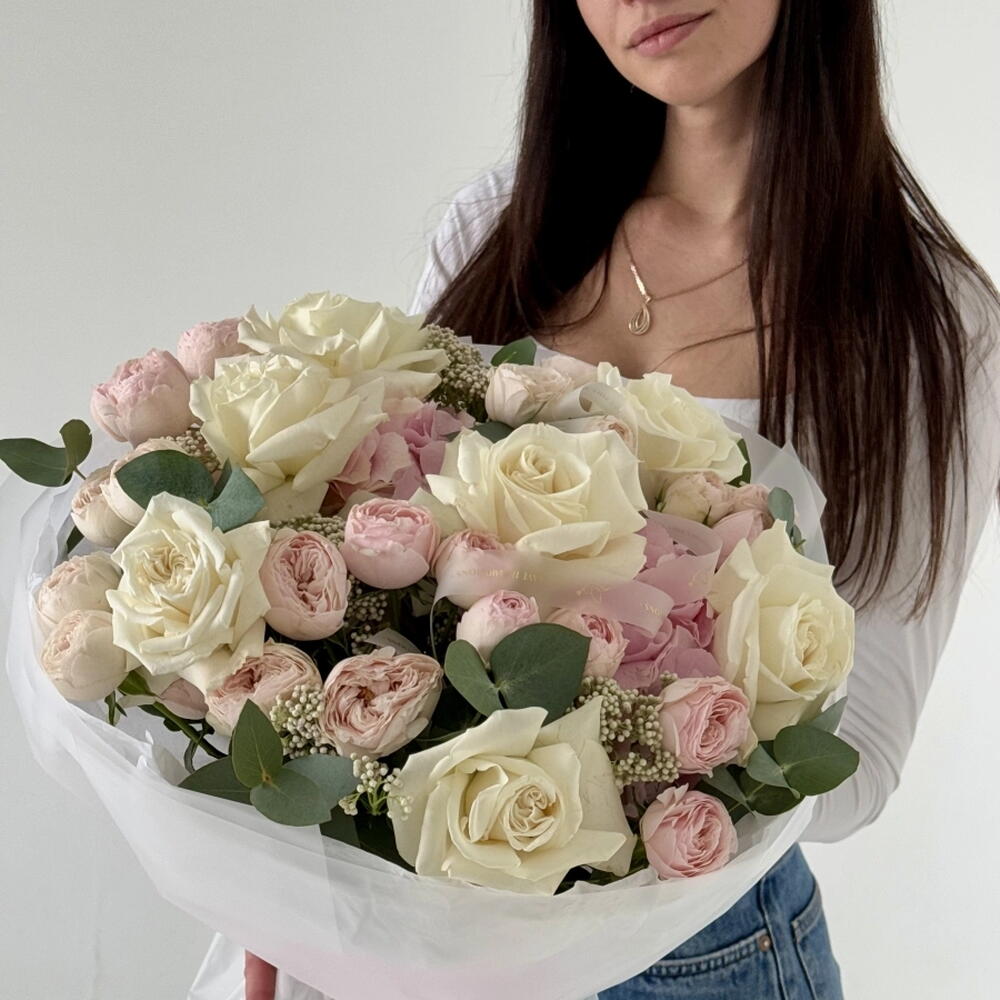 En nuestra oferta te presentamos una delicada y elegante combinación de Brunia, bellamente acompañada por cuatro ramas de Eucalyptus para garantizar una impresión duradera. Para añadir un toque femenino, hemos añadido seis rosas de aerosol rosado. Pero lo más destacado de esta composición es sin duda la presencia de siete grandes rosas que son el epicentro de todo. Una propuesta perfecta para ocasiones especiales, donde lo más importante es la belleza y la originalidad.
