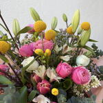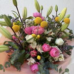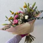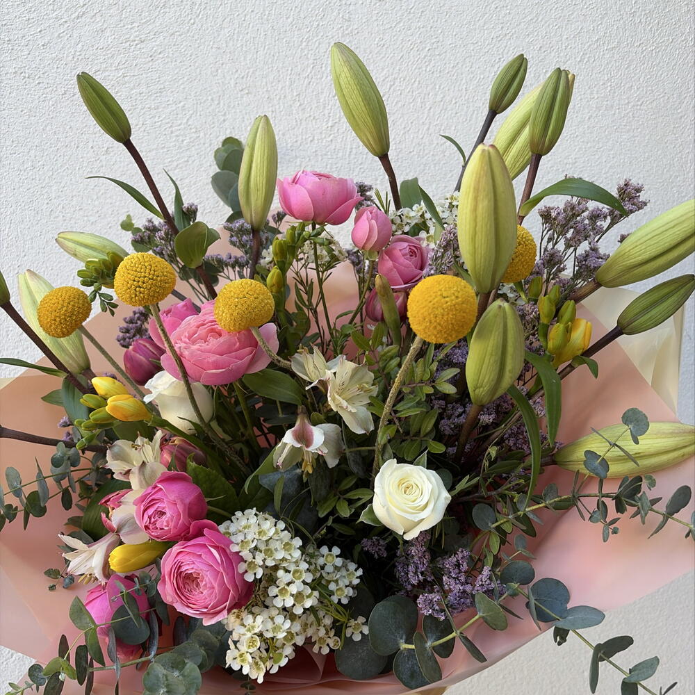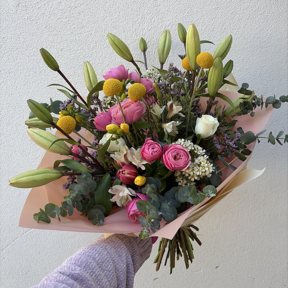 Tulips - 4 pcs Freesia - 4 pcs lily white - 4 pcs craspedia - 5 pcs wax - 3 pcs narcissus - 5 pcs astromeria - 2 pcs roses - 2 pcs spray roses pink - 5 pcs Tea lavender - 3 pcs