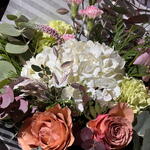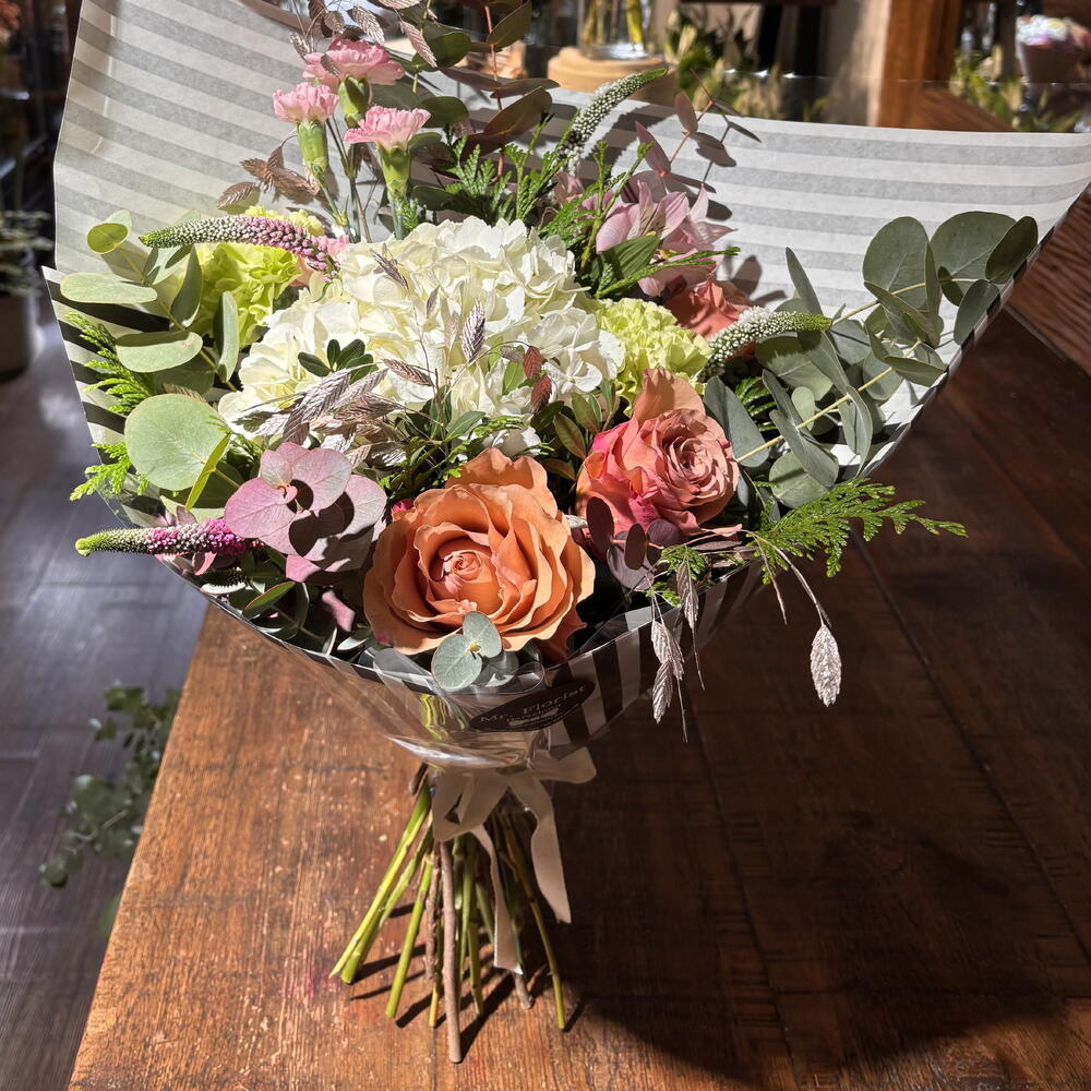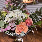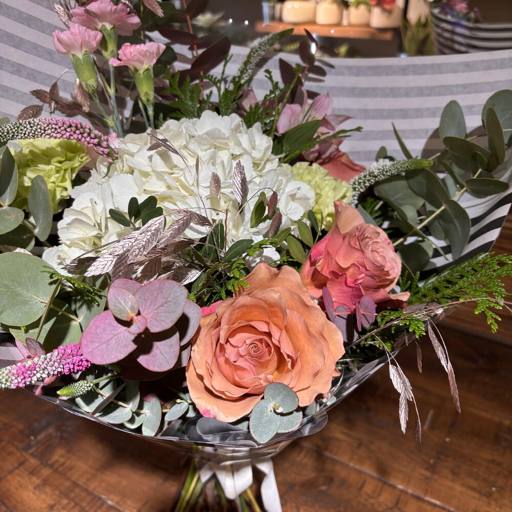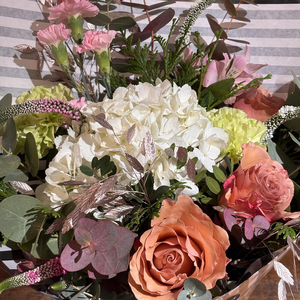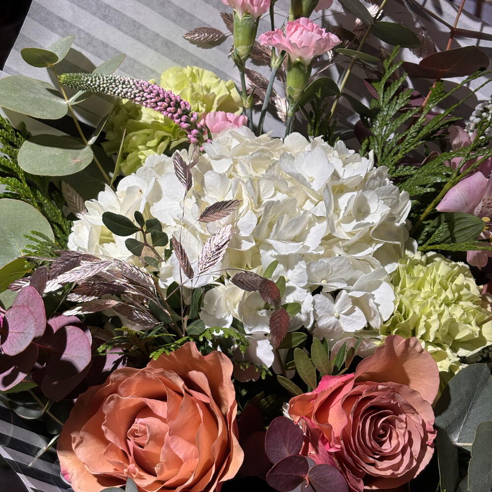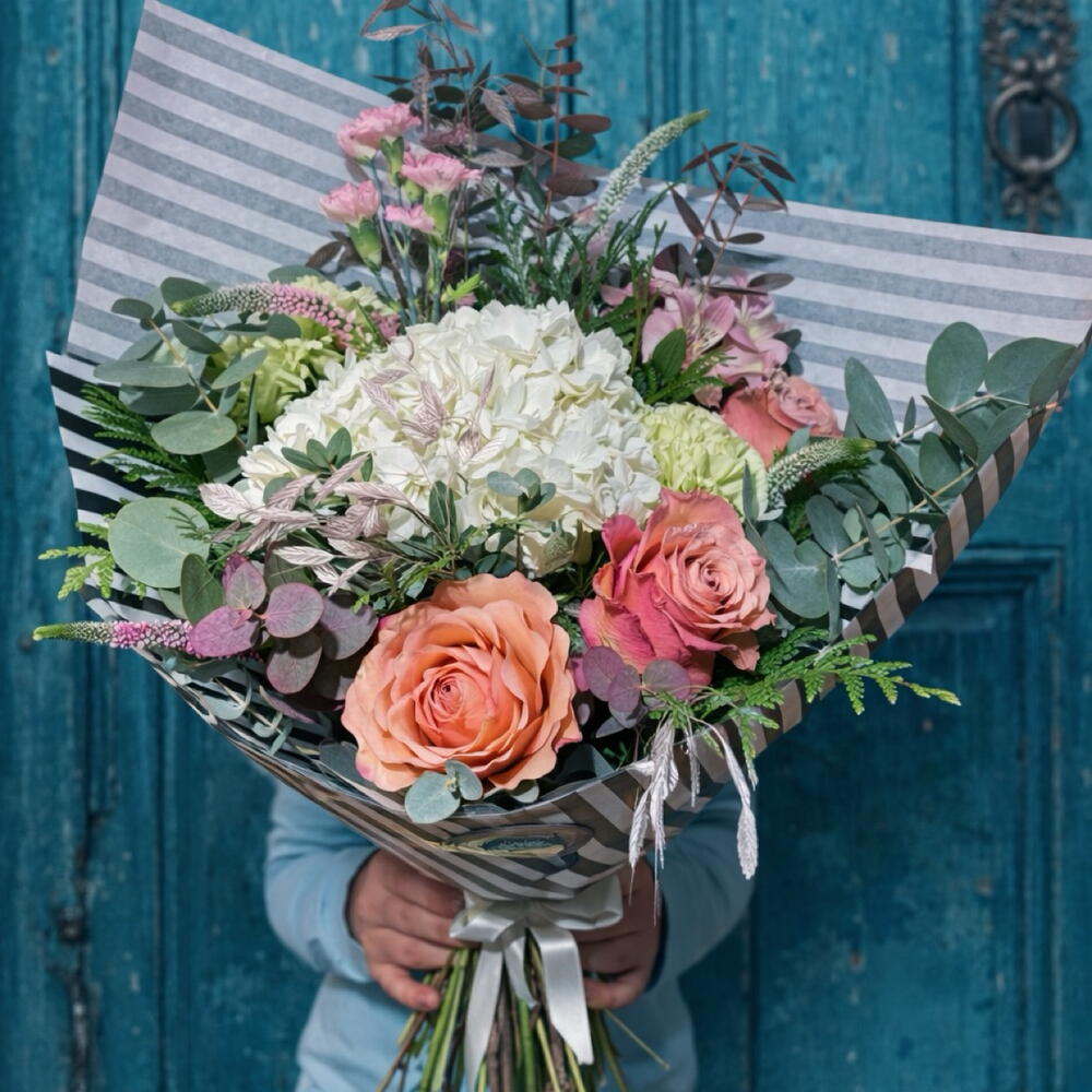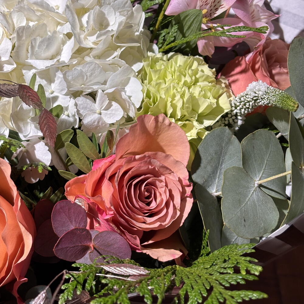 Alstroemeria - 2 pcs hydrangea - 1 pcs eucalipto cinerea - 4 pcs green carnation - 2 pcs verónica - 4 pcs salmon garden rose - 3 pcs green mix - 6 pcs chasmantium pink - 3 pcs