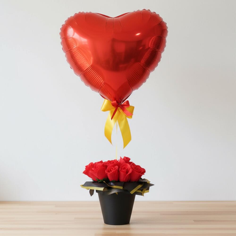 red silk roses - 24 pcs matte black plastic pot base - 1 pcs metallic heart-shaped balloon - 1 pcs