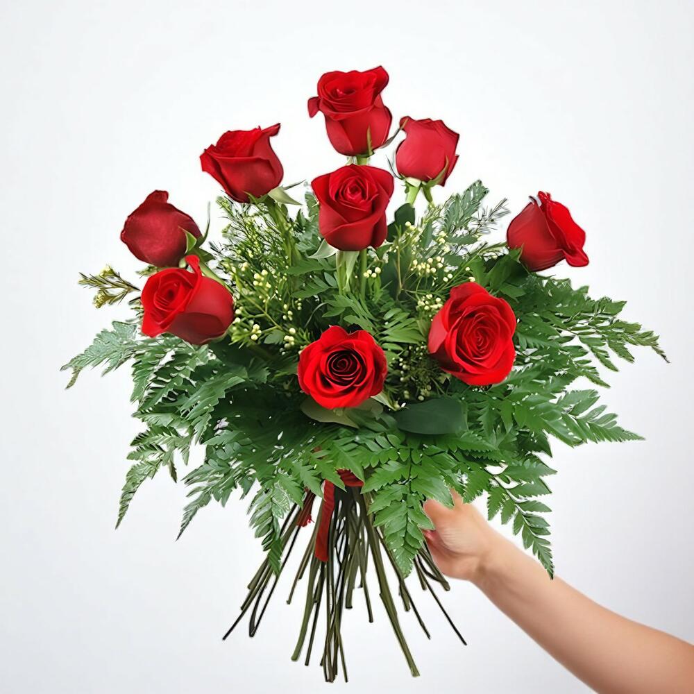 This product is a classic bouquet, elegantly composed of 9 long-stem red roses that symbolize deep love and passion, complemented by 1 mixed greenery. The perfect balance between beauty and meaning, this bouquet is the ideal companion for all your special occasions or simply to brighten someone's day.