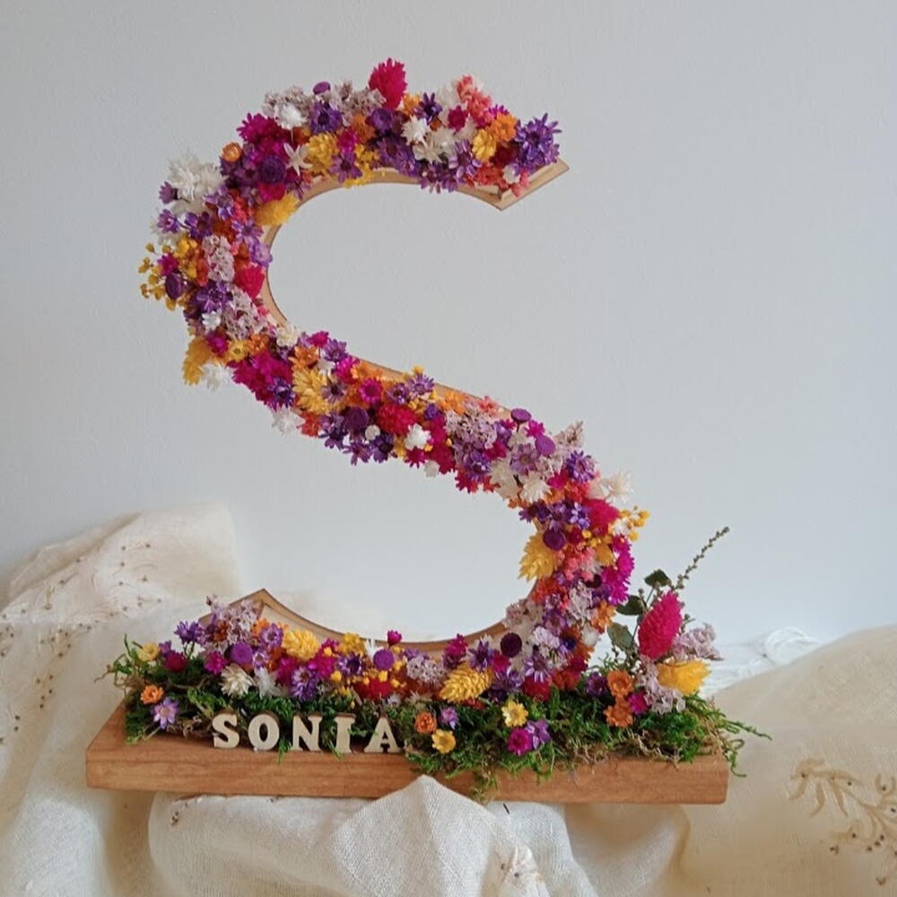 Handmade personalized decorative letter crafted with preserved and dried flowers, integrated with warm LED light. Each piece is made on a wooden letter decorated with flowers and is presented on a wooden base also decorated, personalized with the full name in wooden letters, making it a unique and special gift. It is ideal for decorating children's rooms, gifting for birthdays, births, communions, or special occasions. Features: Wooden letter decorated with preserved and dried flowers Integrated LED lighting Decorated wooden base with personalized name Handcrafted product, handmade As this is a handcrafted and personalized product, each piece may present slight variations while always maintaining the same style and quality. Preparation time 3-4 working days For urgent orders, contact us before making the purchase. Want to make it even more special? You can add chocolates as an extra detail in the final step of the purchase.
