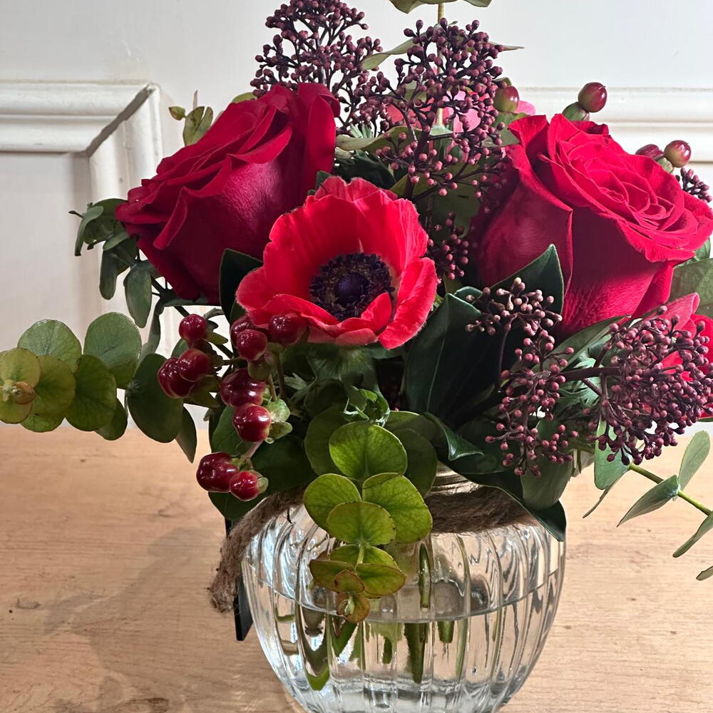 Rope vase with red roses and selected flowers. Perfect for gifting to a loved one, saying thank you, or offering encouragement.