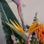 Un arreglo espectacular que combina la exótica belleza de las aves del paraíso con la calidez de las gerberas naranjas y la elegancia de las rosas rojas. Este diseño, enriquecido con follaje verde vibrante y toques de eucalipto, evoca la energía y el colorido de un paraíso tropical. Perfecto para sorprender en ocasiones especiales como aniversarios, celebraciones o simplemente para llenar cualquier espacio de vida y alegría. ¡Un regalo que transmite emoción, frescura y una belleza inolvidable! Centro floral con minimalismo con flores tropical como aves del paraíso una composición en una armonia salvaje y colorida