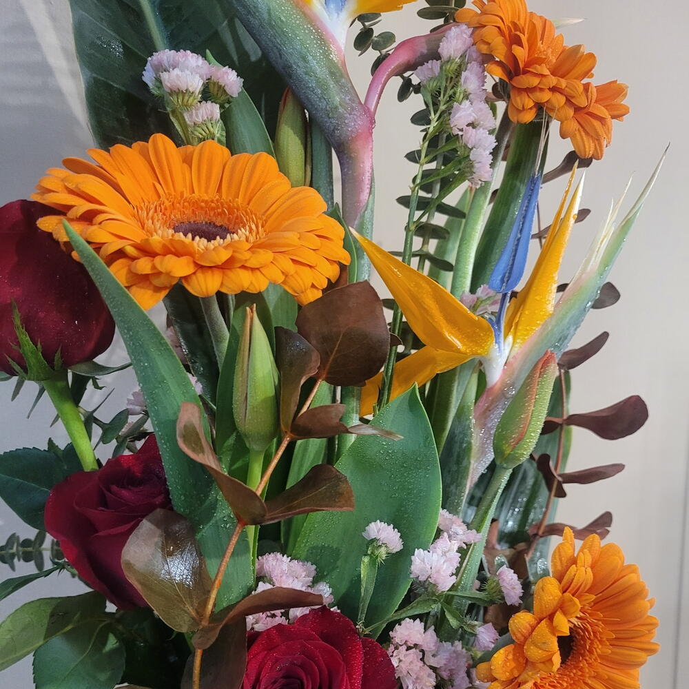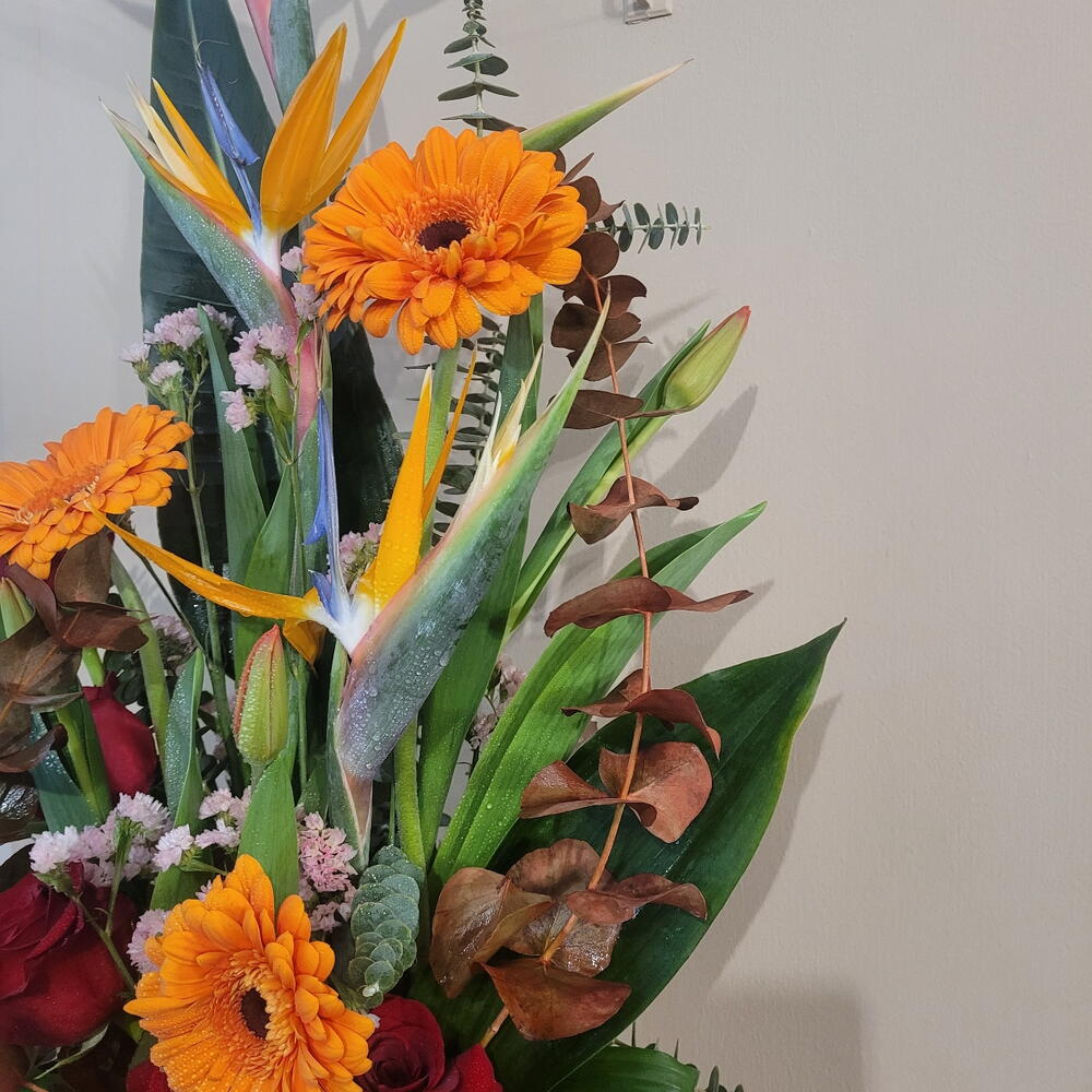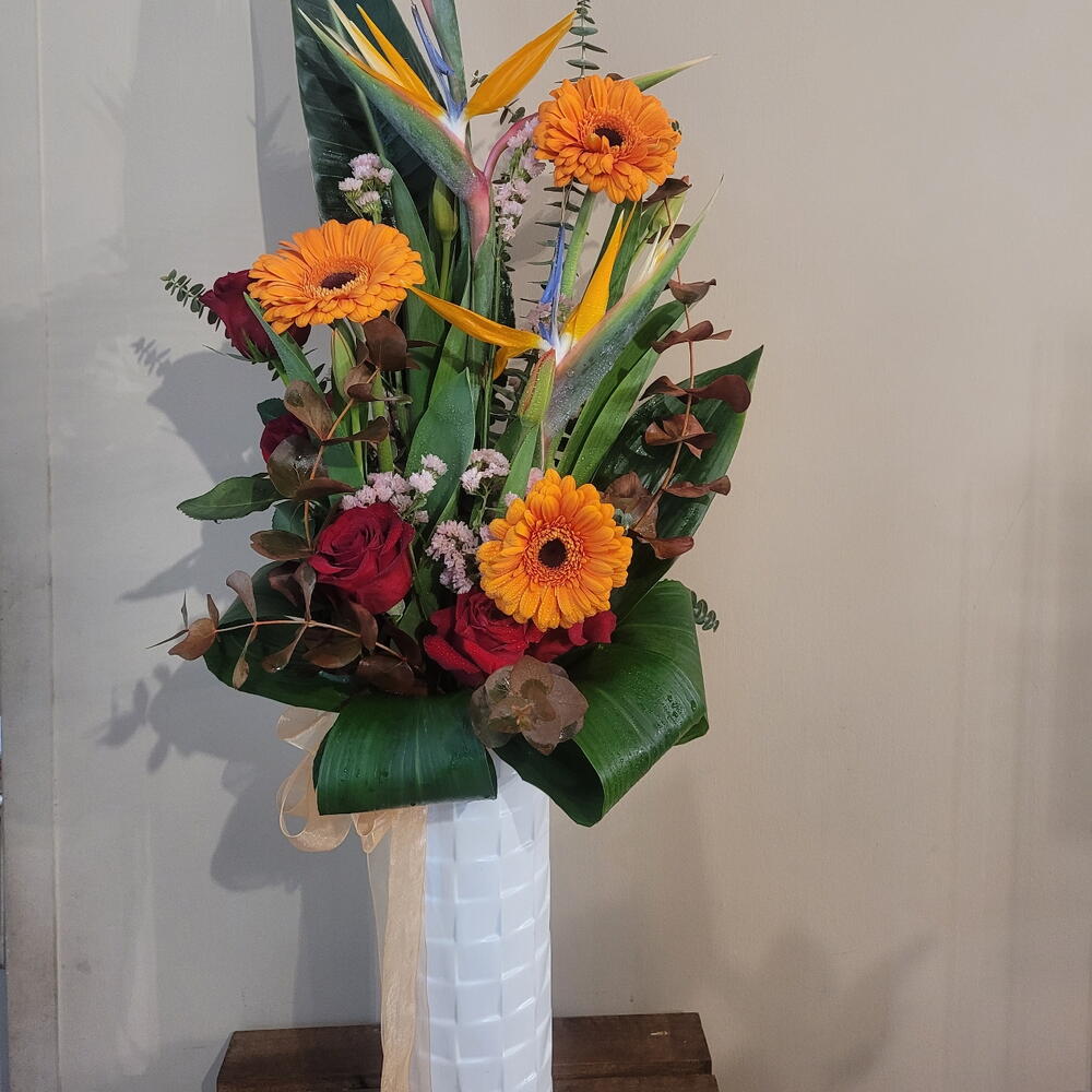 Un arreglo espectacular que combina la exótica belleza de las aves del paraíso con la calidez de las gerberas naranjas y la elegancia de las rosas rojas. Este diseño, enriquecido con follaje verde vibrante y toques de eucalipto, evoca la energía y el colorido de un paraíso tropical. Perfecto para sorprender en ocasiones especiales como aniversarios, celebraciones o simplemente para llenar cualquier espacio de vida y alegría. ¡Un regalo que transmite emoción, frescura y una belleza inolvidable! Centro floral con minimalismo con flores tropical como aves del paraíso una composición en una armonia salvaje y colorida