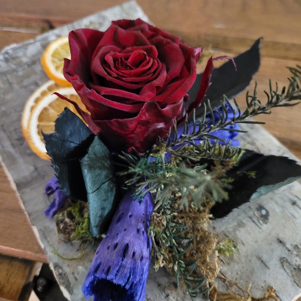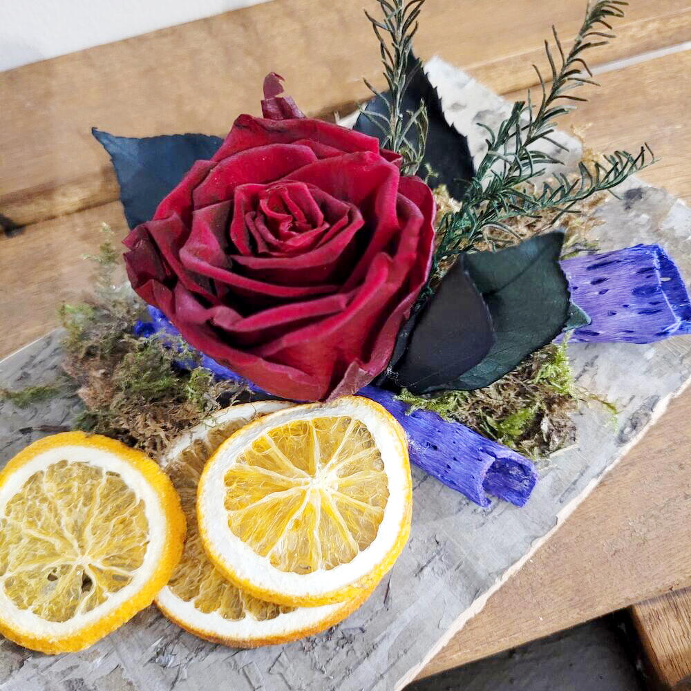 Un detalle lleno de encanto rústico y natural, compuesto por una elegante rosa roja eterna acompañada de rodajas de naranja deshidratada, musgo fresco y detalles en tonos púrpura. Dispuesto sobre una base de corteza natural, este diseño es perfecto para quienes valoran la belleza de la simplicidad y la conexión con la naturaleza. Ideal como decoración única para el hogar o como regalo especial que transmite calidez y estilo. ¡Un toque de naturaleza para alegrar cualquier rincón o momento! Diseño de centro de rosa liofilizada un bonito regalo para Sant Jordi el cual le perdurará por mucho tiempo