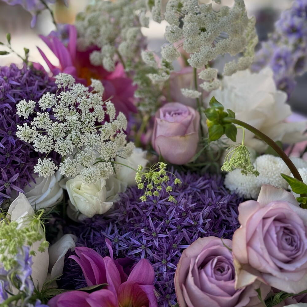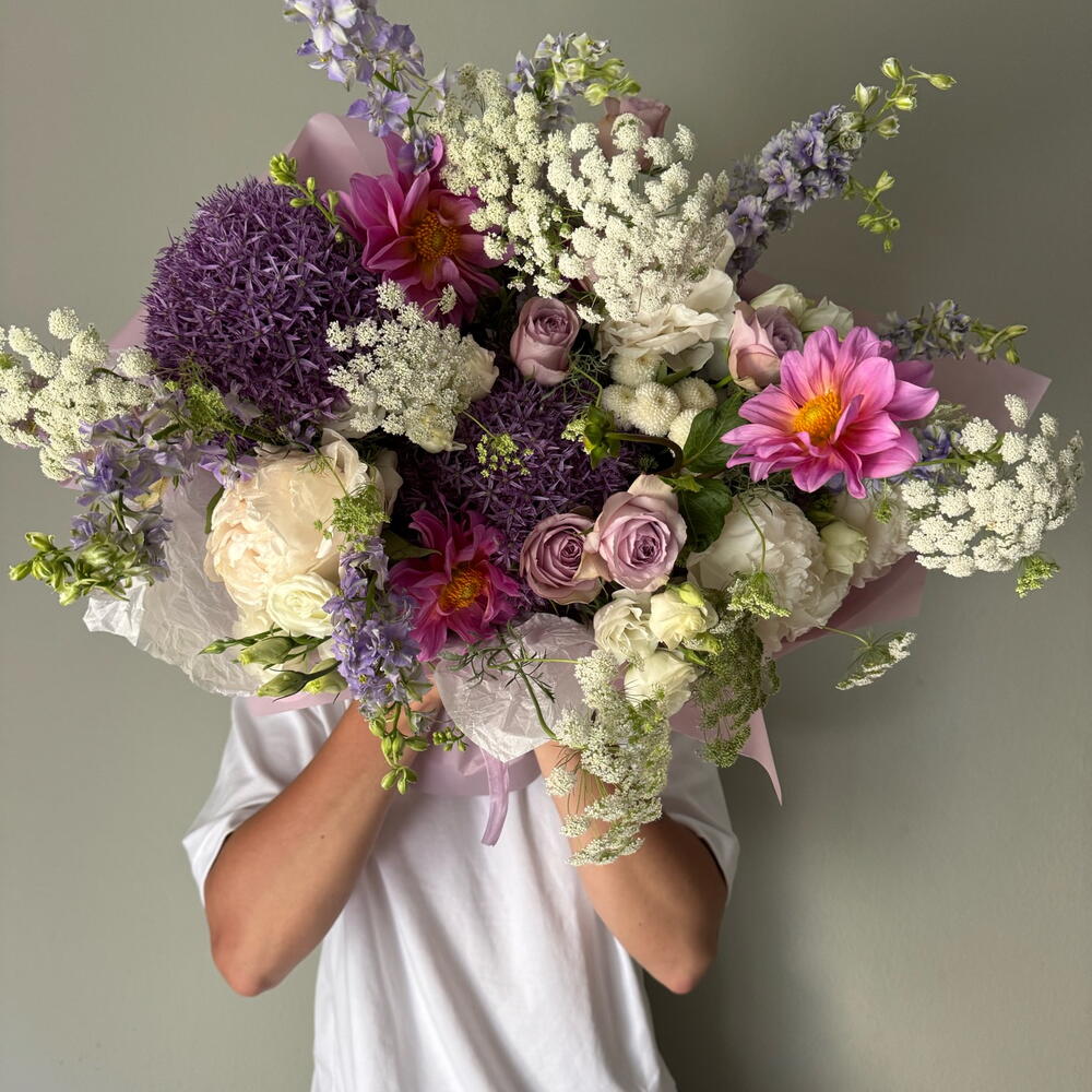 Lisianthus - 5 pcs Peony - 5 pcs mom - 10 pcs delphinium - 5 pcs allium - 2 pcs dahlias - 5 pcs roses - 10 pcs