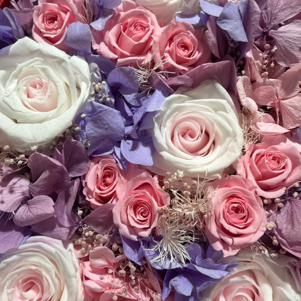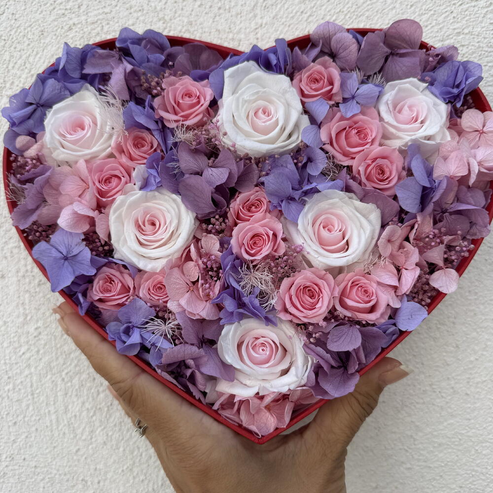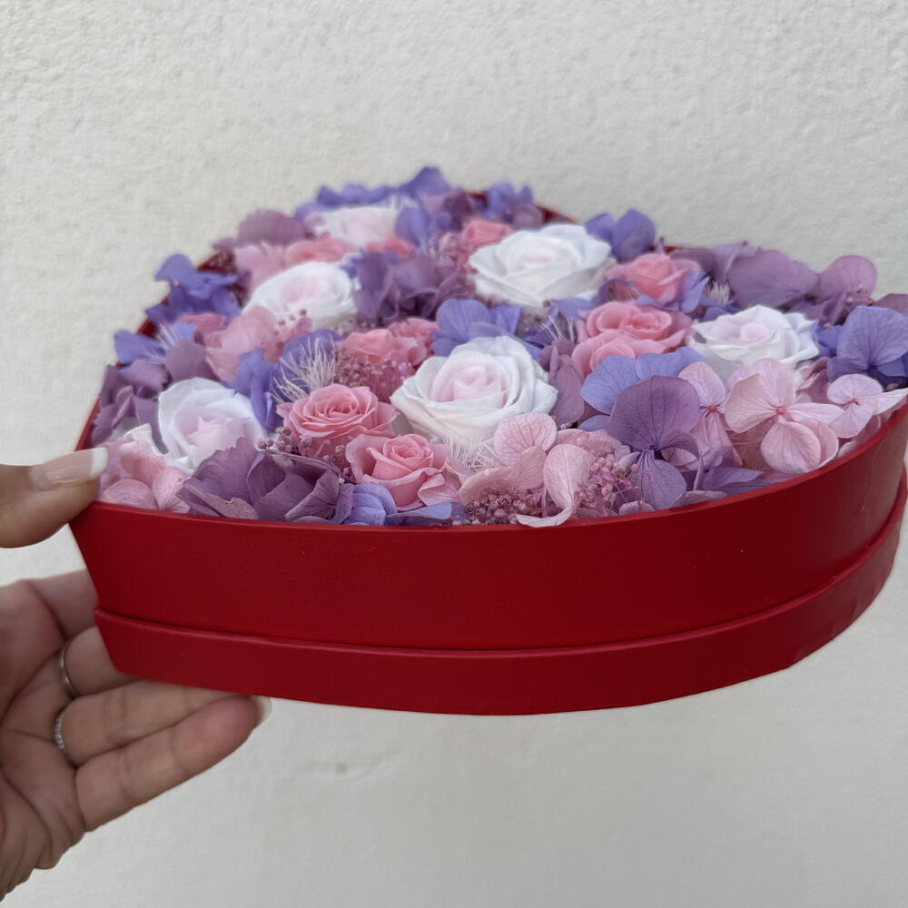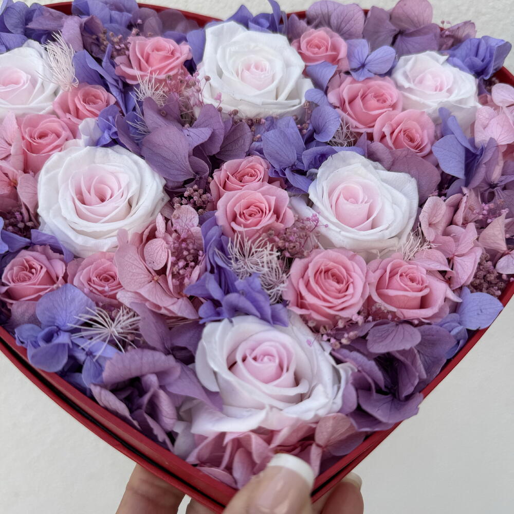 preserved rose - 6 pcs heart box - 1 pcs dried flower - 5 pcs preserved hydranges - 3 pcs preserved mini rose - 12 pcs