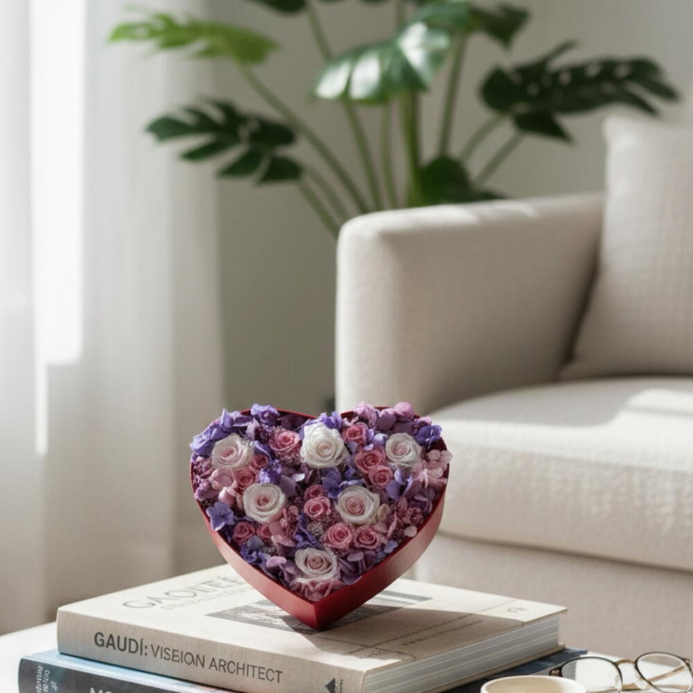 Elevate your space with a timeless piece of Barcelona art. Unlike fresh flowers that last only days, this hand-crafted heart features premium preserved roses and hydrangea designed to maintain their beauty for 1 to 3 years. Featuring a sophisticated palette of soft lavender, powder pink, and cream, this arrangement aligns perfectly with the 2026 Dreamy Refined aesthetic. It is the perfect blend of modern sculpture and natural elegance. • Sustainable Luxury: A long-lasting alternative to fresh-cut flowers. • Maintenance Free: No water or sunlight required. • Versatile Decor: Ideal as a centerpiece, wall art, or a keepsake for anniversaries and new homes. Give a gift that stays as beautiful as the day it arrived. *ring in the photo is for display only, not included