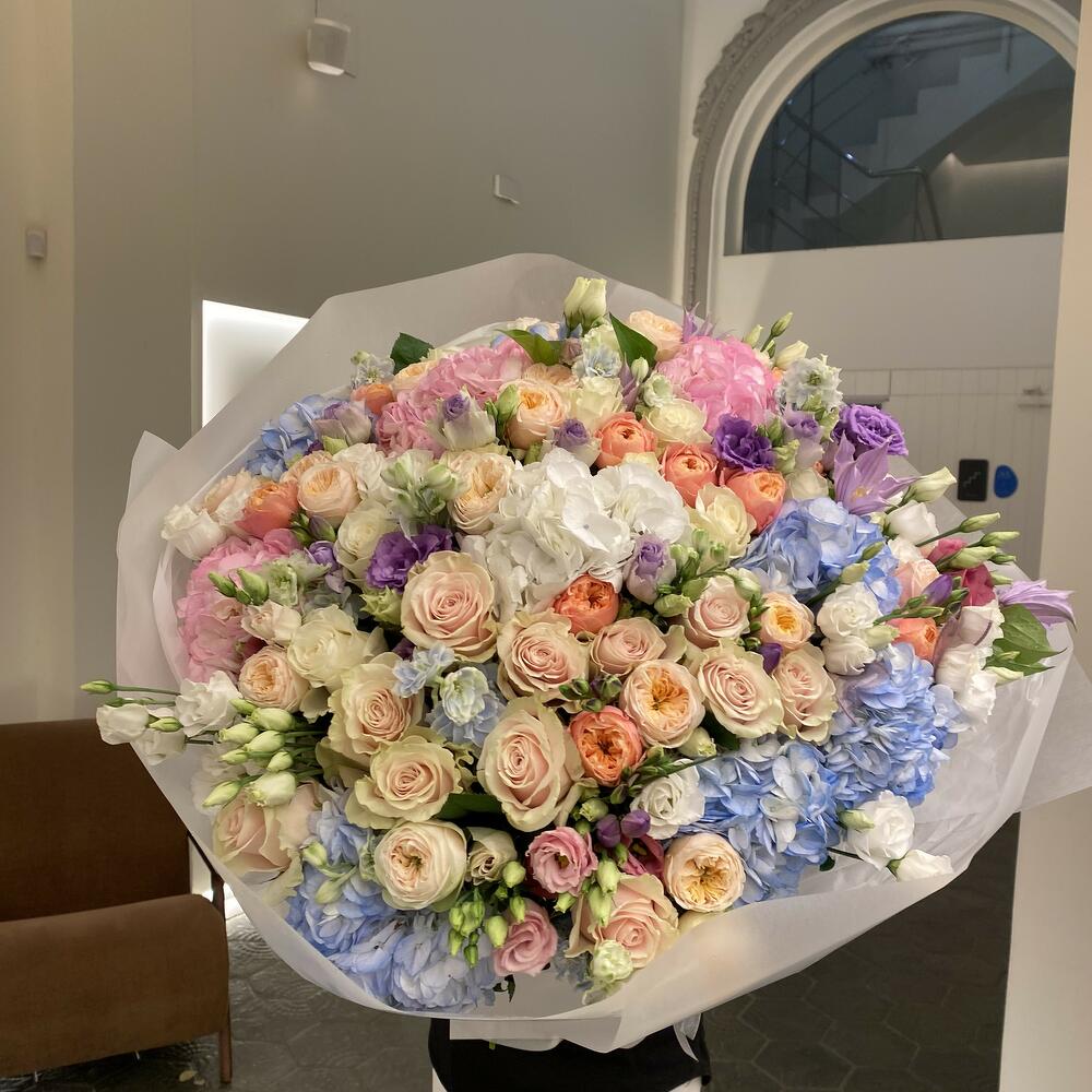 Hydrangea - 8 pcs rose - 10 pcs garden rose - 10 pcs delphinium - 5 pcs lisiathus - 10 pcs