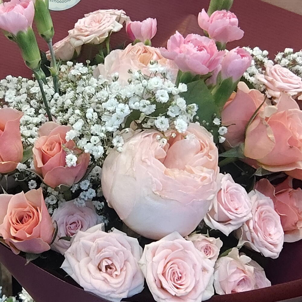 Un ramo lleno de suavidad y elegancia que captura la esencia de la delicadeza. Las peonías y rosas en tonos pastel se mezclan con claveles rosados y gypsophila blanca para crear una composición romántica y femenina. Perfecto para regalar en aniversarios, cumpleaños o simplemente para expresar cariño y ternura. El envoltorio en papel burdeos contrasta maravillosamente con las flores, añadiendo un toque de sofisticación y encanto. Es un regalo que ilumina cualquier momento especial y transmite sentimientos sinceros.