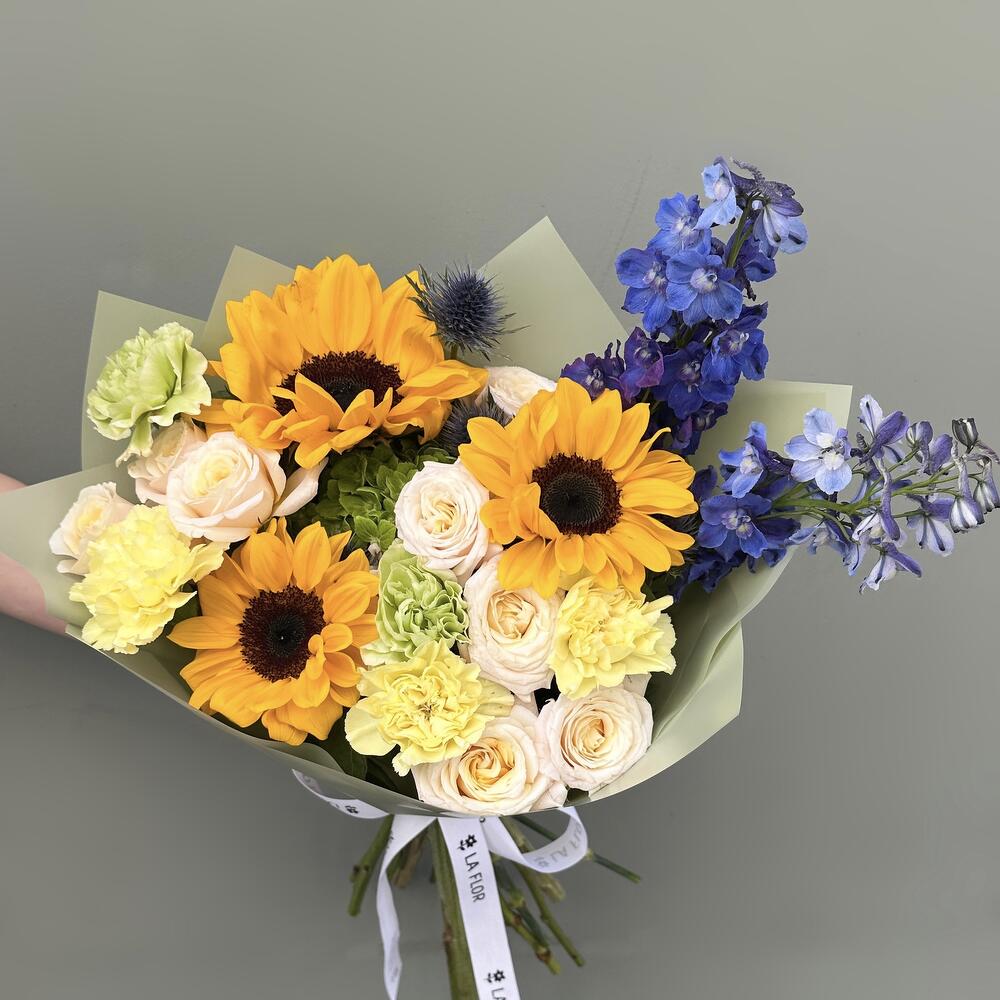 hydrangea - 1 pcs eryngium - 2 pcs delphinium - 2 pcs clavel - 5 pcs girasoles - 3 pcs mini rose - 3 pcs