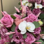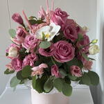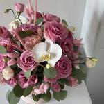 Eucalyptus - 5 pcs Lisianthus - 5 pcs Decoration - 10 pcs Orchid - 4 pcs packaging design - 3 pcs roses pink - 10 pcs