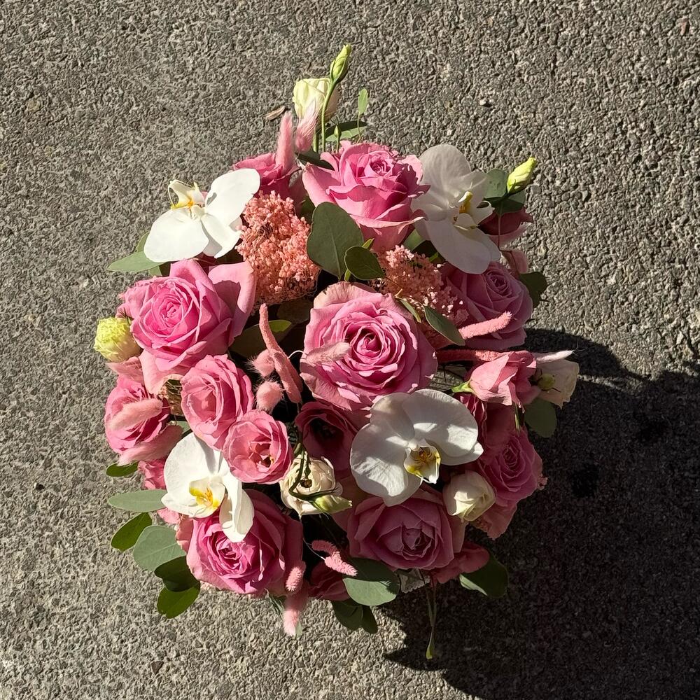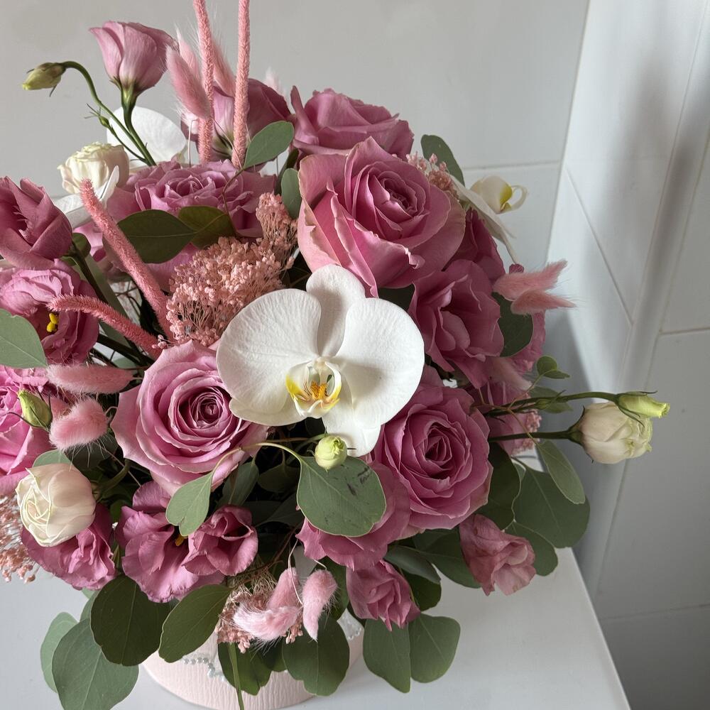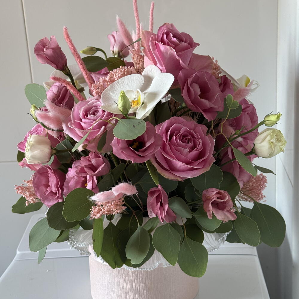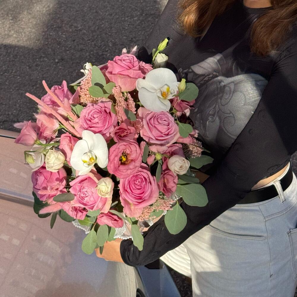 Eucalyptus - 5 pcs Lisianthus - 5 pcs Decoration - 10 pcs Orchid - 4 pcs packaging design - 3 pcs roses pink - 10 pcs