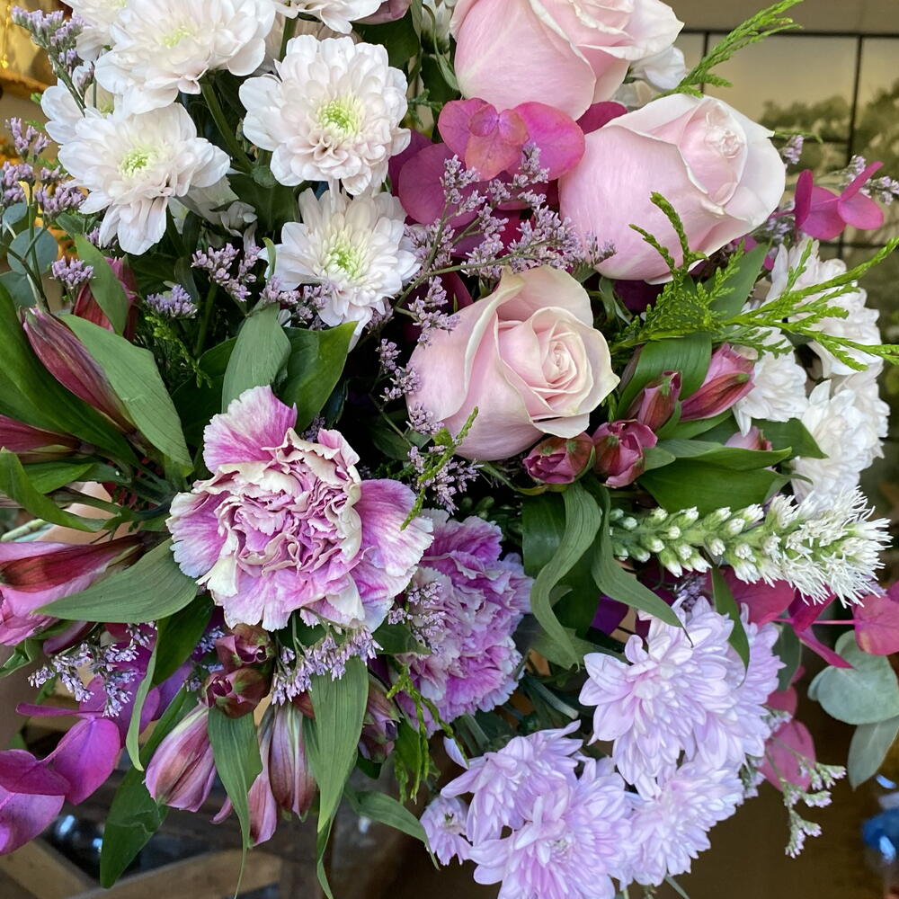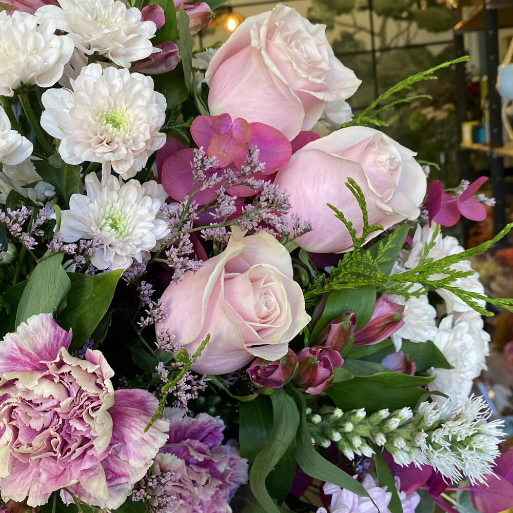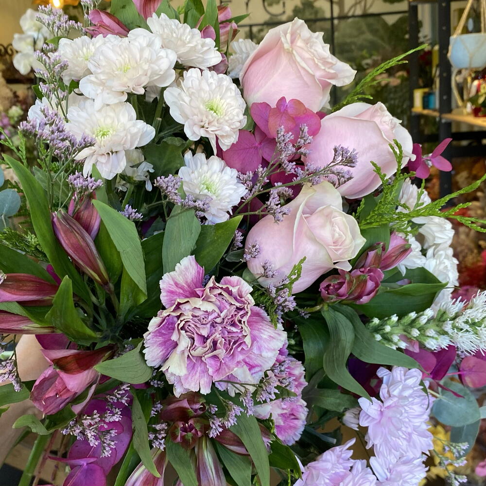 Limonium - 3 pcs margaritas - 3 pcs claveles - 3 pcs premium roses - 3 pcs foliage - 6 pcs alstroemerias - 3 pcs