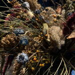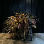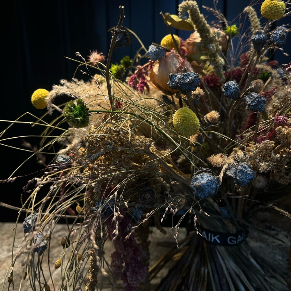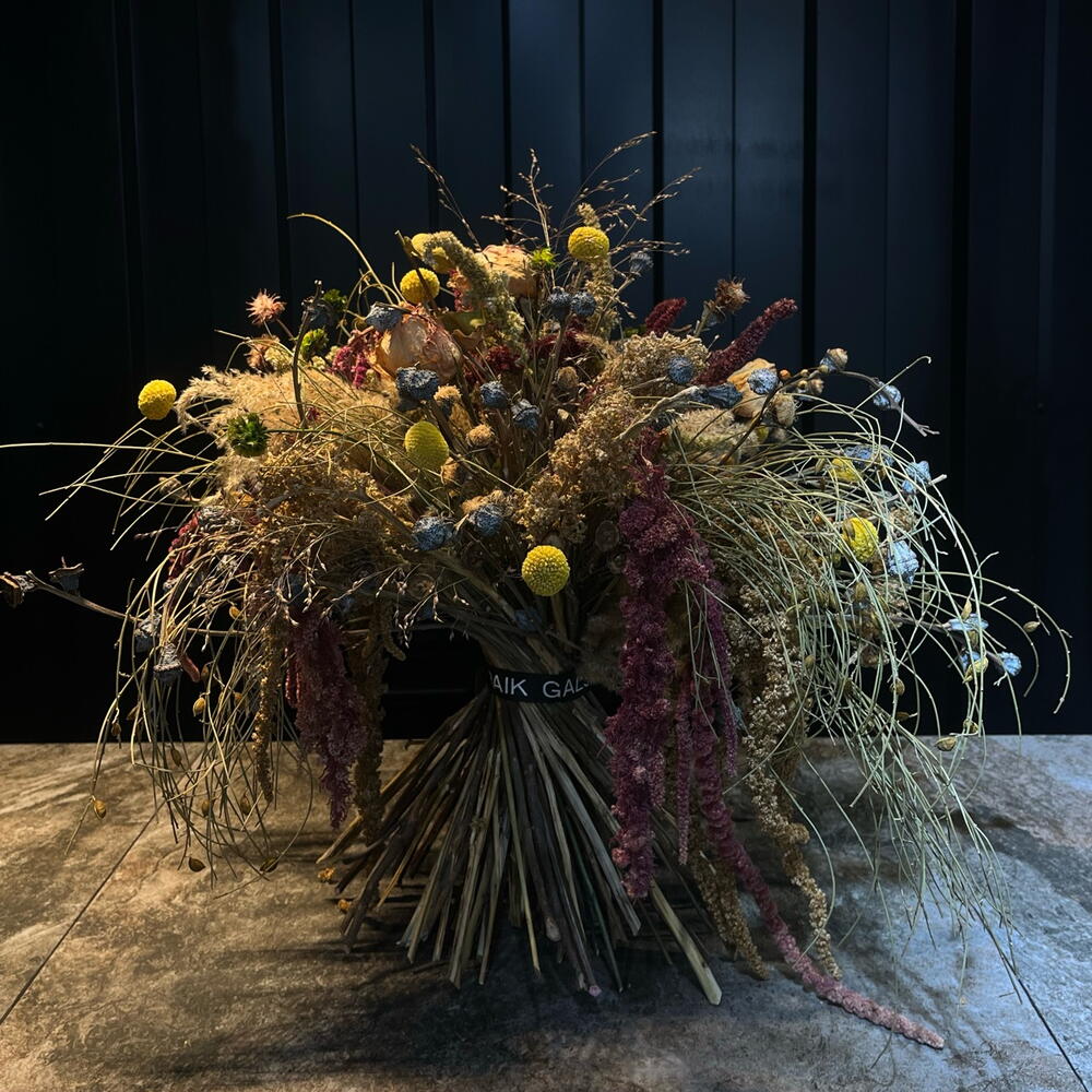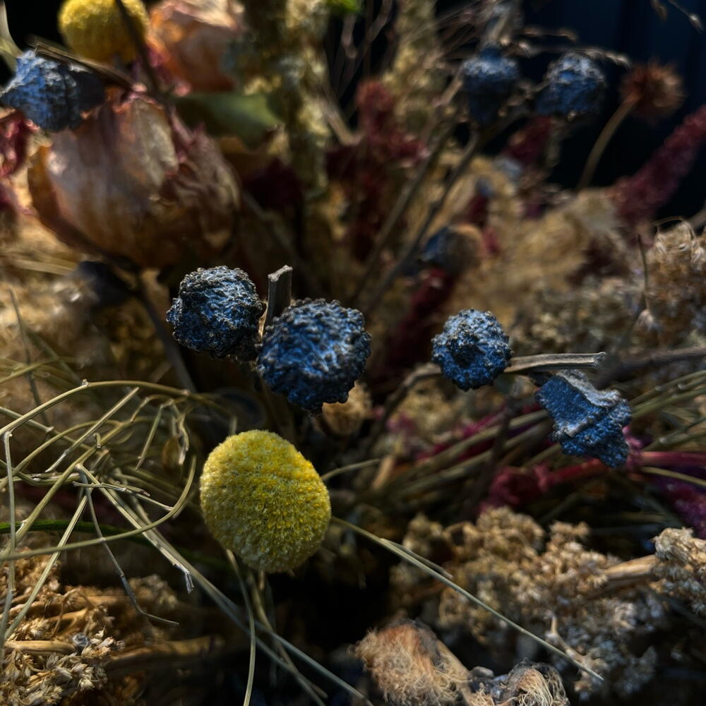 It's a dried bouquet with an autumn soul, darling: a wild and elegant explosion of textures. Long stems that arch like sighs, little yellow balls that look like tiny suns, blue and reddish sprigs that provide contrast, and a straw heart that holds it all like a rustic hug. It has the vibe of a magical forest found at dusk.